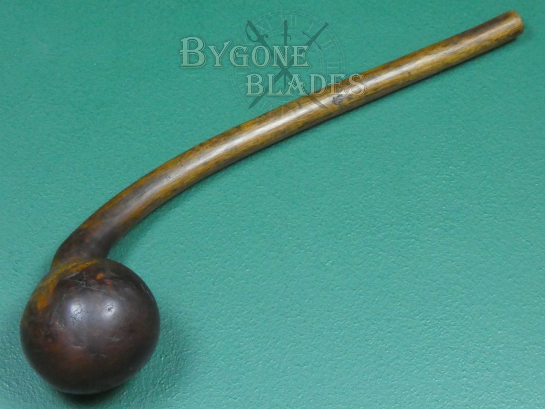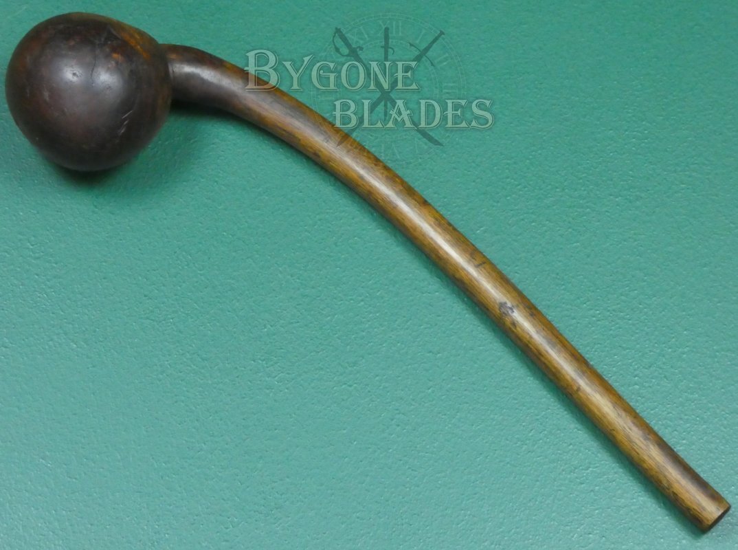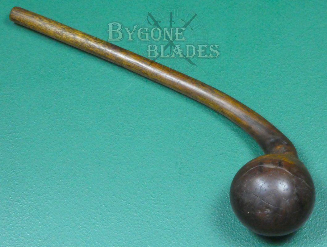 This fearsome hardwood club has an enormous head that has a diameter of 94mm across and has a depth of 87mm. The club has a total length of 465mm. The club is in great condition with minor age-related cracks to the head.
