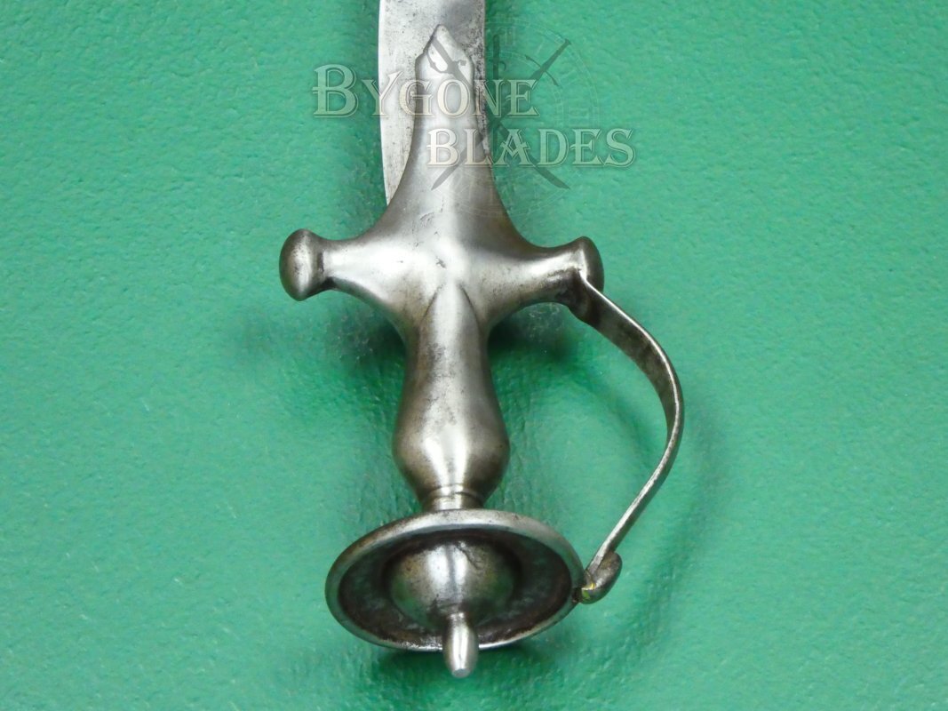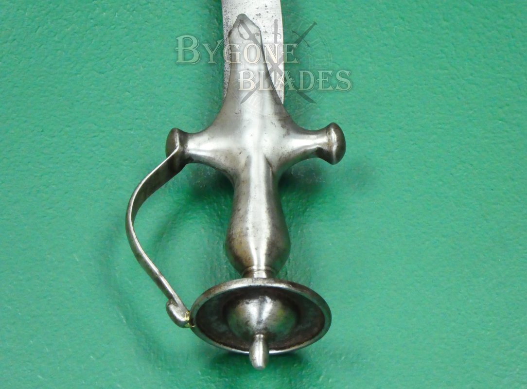 The robust steel hilt has a baluster style grip and long, clubbed languets. The hilt terminates with a disc pommel, incorporating a dome and skull crusher spike. The cross-guard has domed finials and continues into a recurved knuckle bow with a scrolled terminal. The blade is firm in the hilt.