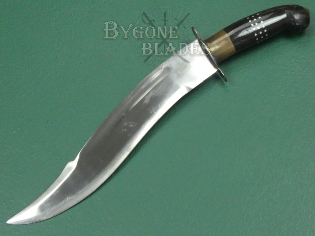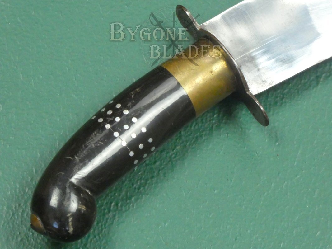 The shaped buffalo horn grip is decorated with three bands of inlaid metal dots and has a brass bolster with a plated steel crosspiece. The tang of the blade is peened through the pommel of the grip. The blade is firm in the hilt.