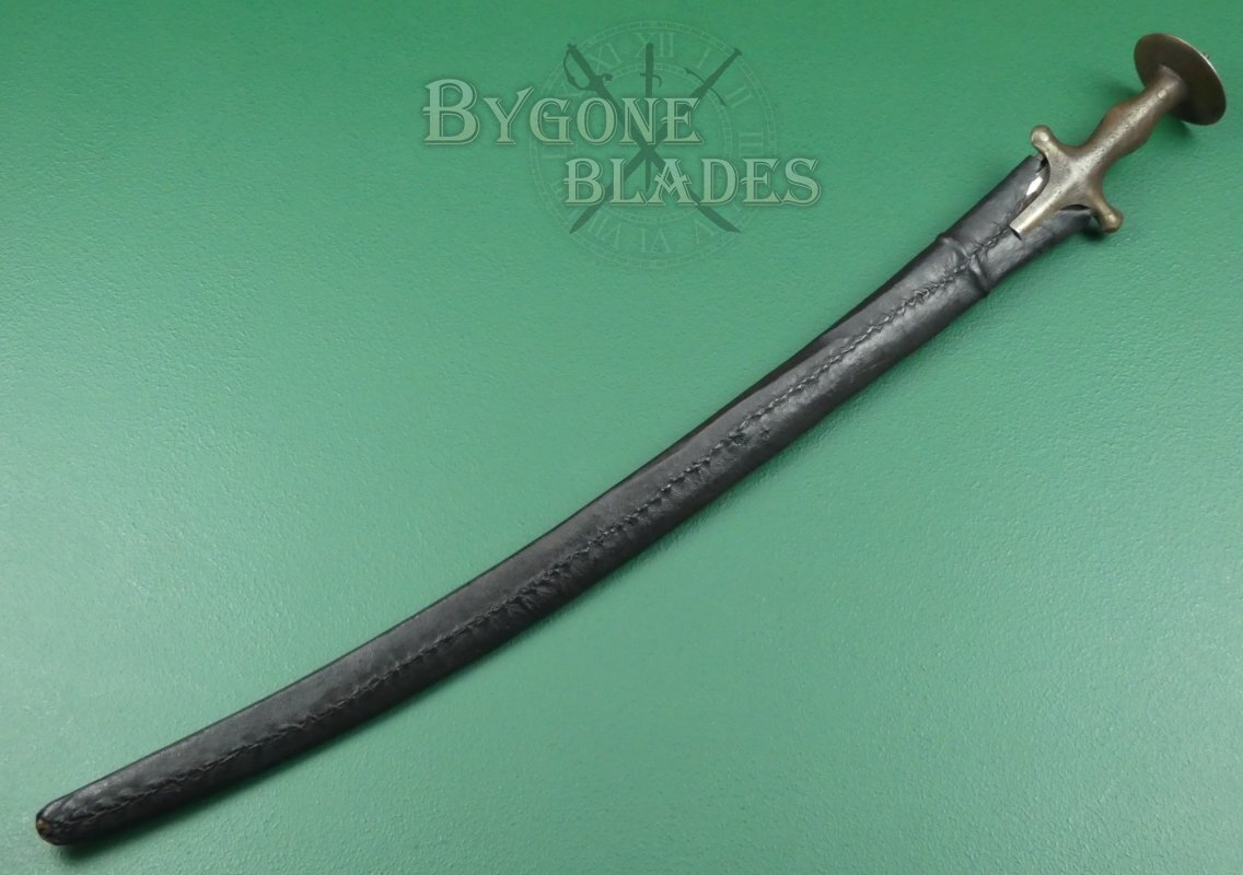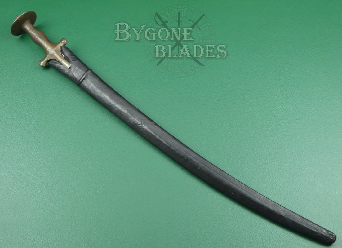 The sword is complete with its leather covered wooden scabbard. The scabbard has age and use related wear. The stitching is intact and tight and the tulwar draws and sheathes smoothly.