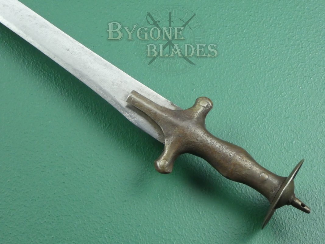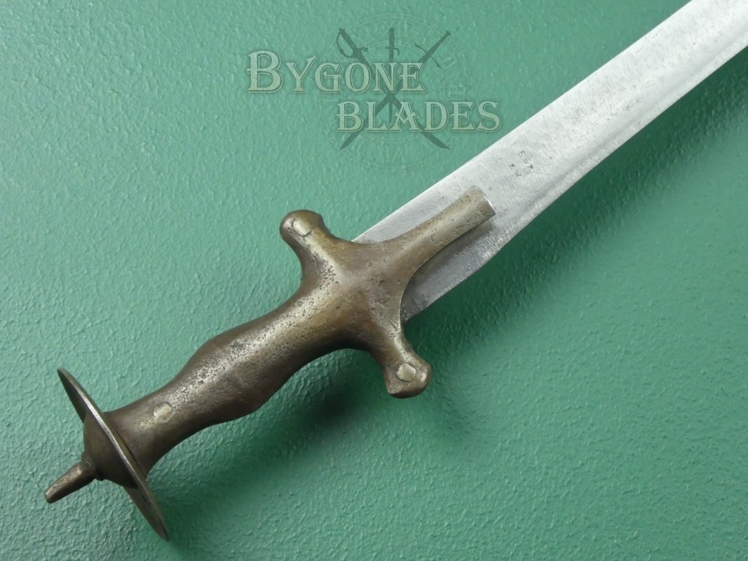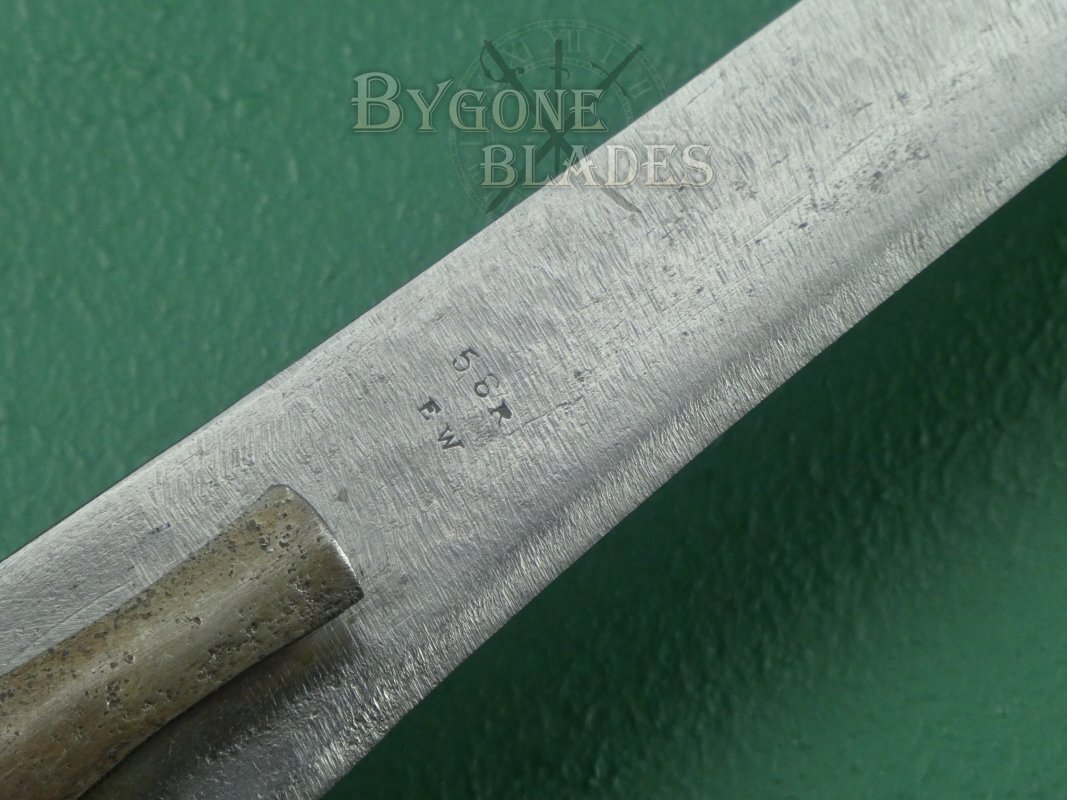 The 670mm slightly curved blade has a flat spine and terminates in a spear point. The single-edged blade is double-edged for the last 160mm. The blade is in good condition and free of rust. The blade was service sharpened on numerous occasions as evidenced by the reduction in width from the forte and retains sharp upper and lower edges. The forte is stamped with what look to be unit markings, 58R over EW.