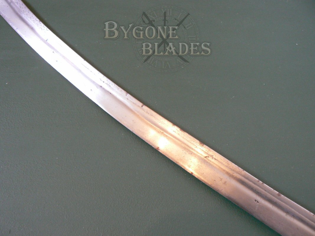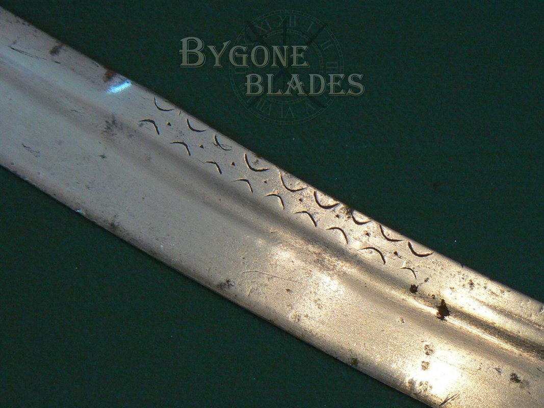The blade is marked behind the false edge on both sides with a row of geometric lines and dots, possibly indicating the armoury which manufactured it. The blade is in excellent condition.