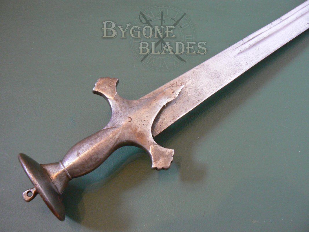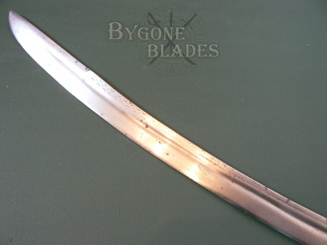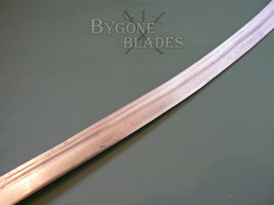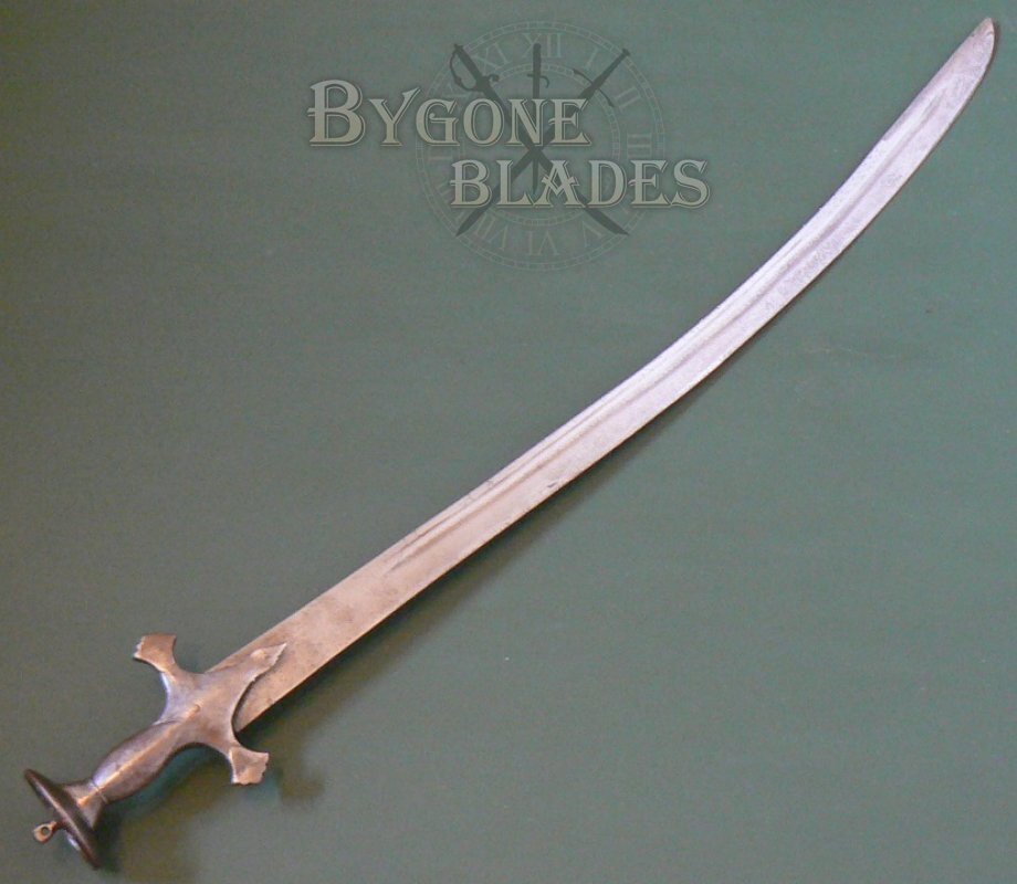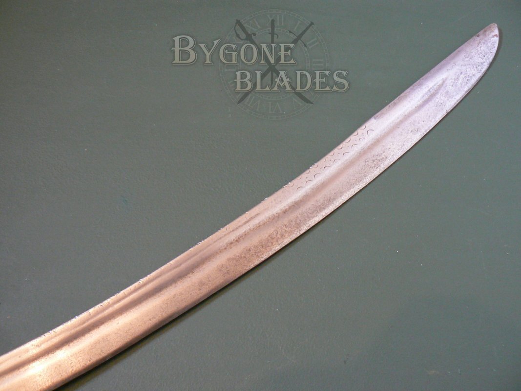 The heavy, 680mm curved blade has a flat, un-tapered spine, terminating in a short false edge and hatchet point. The blade has double fullers, one being little more than an incised line below the spine, the other is wider and deeper.