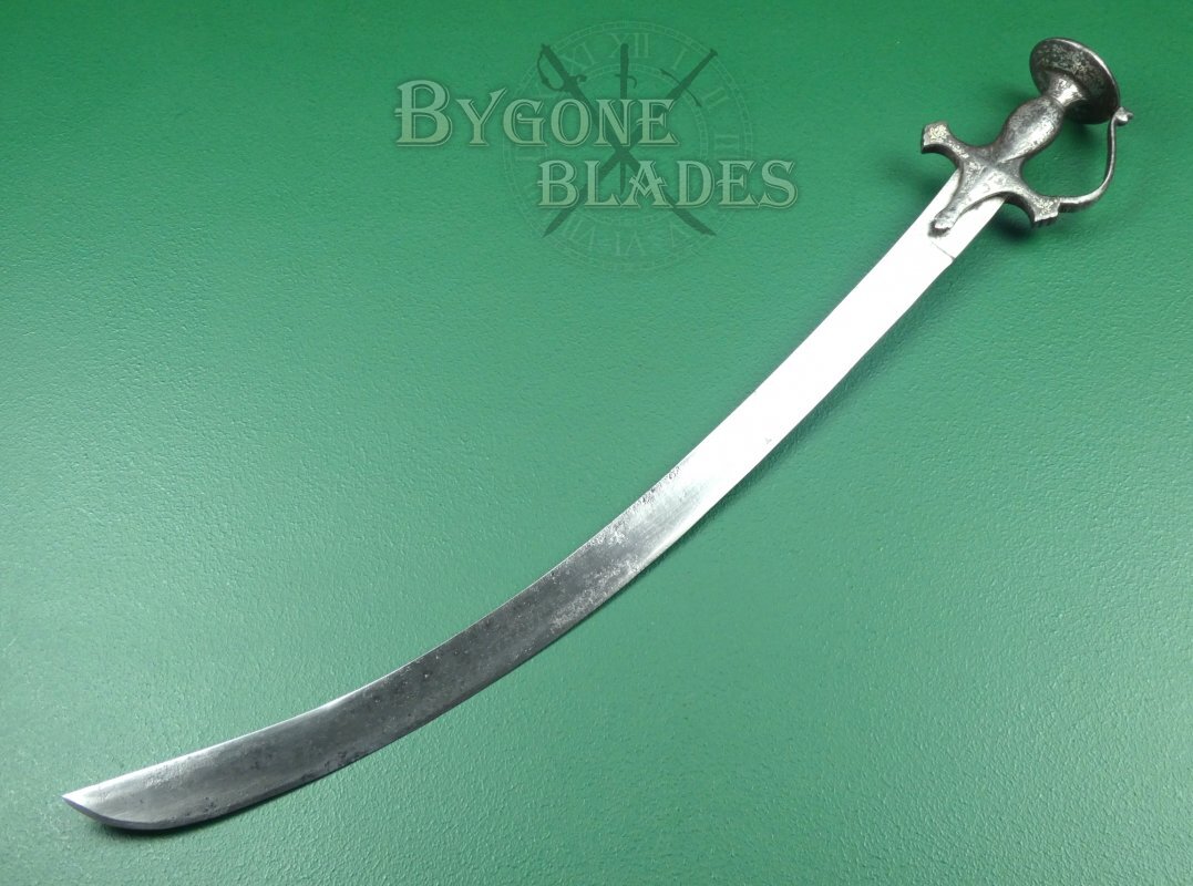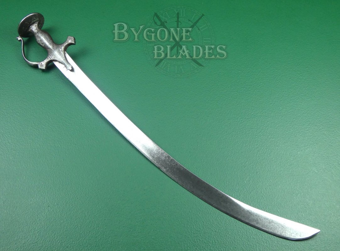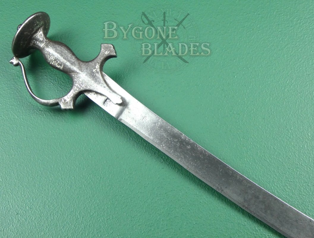 The heavy 612mm blade has a flat spine that is 10mm thick tapering down to 6mm before narrowing sharply into the 140mm upper edge. The blade widens from 30mm to 34mm at the beginning of the double-edged section that terminates in a hatchet point. The quality blade retains a sharp fighting edge and is in good condition for its age and use, with spots of shallow pitting on the spine and mottled tarnish towards the point and along the blade on one side. The ricasso is 38mm wide and bears a maker’s mark.