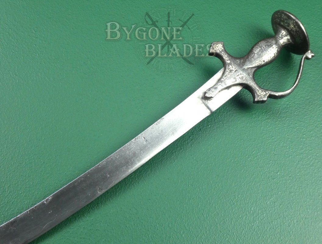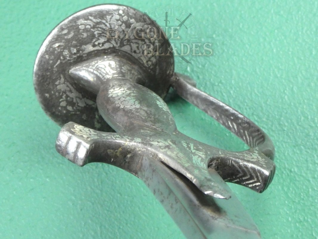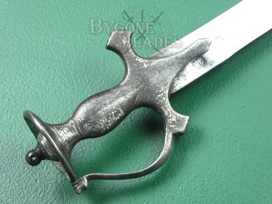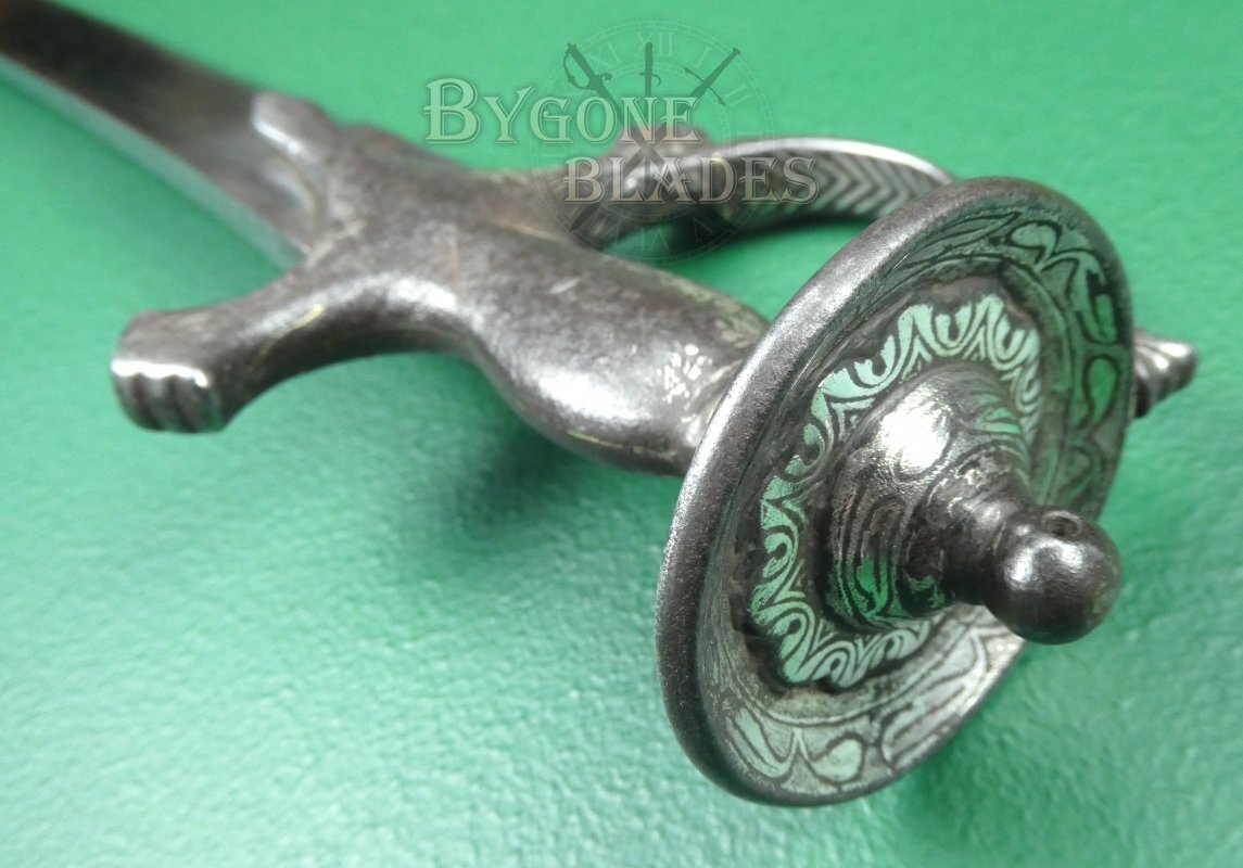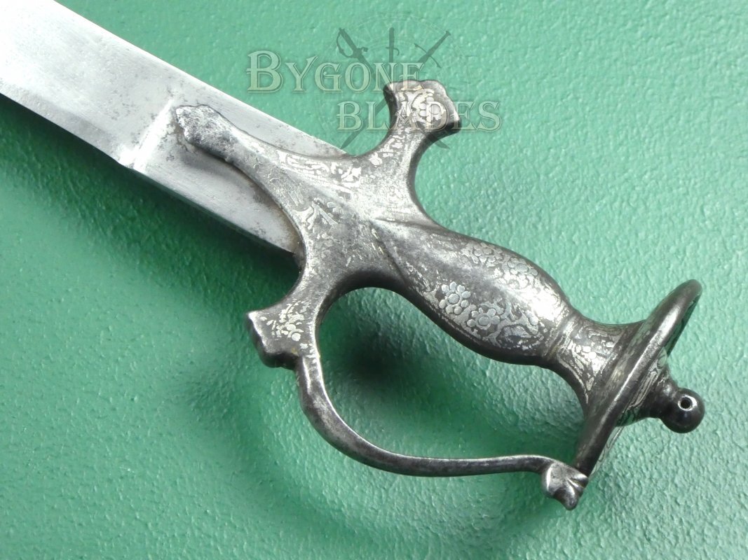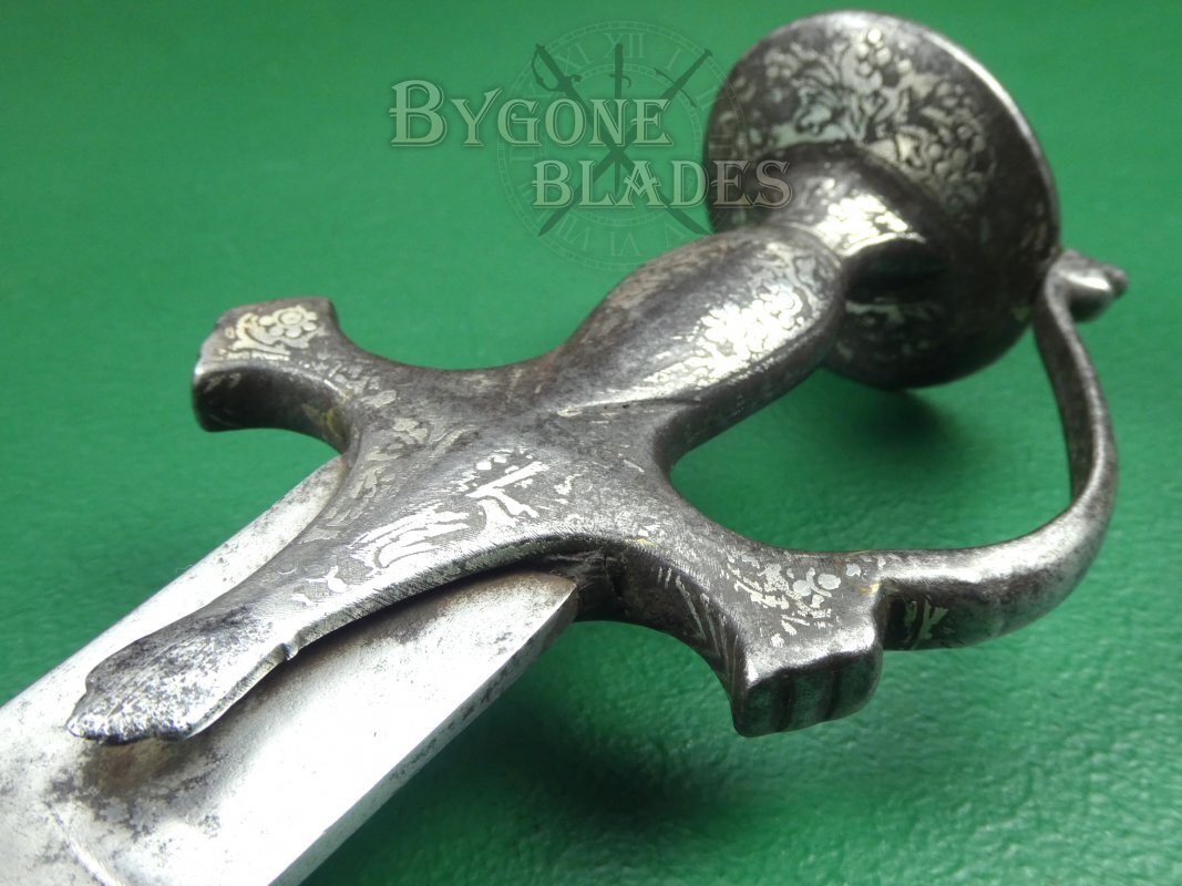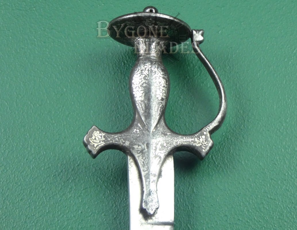 The steel hilt has an oval baluster grip incorporating short, flower head quillons, clubbed languets and a small recurved knuckle-bow ending in a stylised leopard or flower head terminal. The disc pommel incorporates a shaped, flower-like disc with a dome and pierced ball finial. The hilt was ornately decorated in silver koftgari, much of which remains.