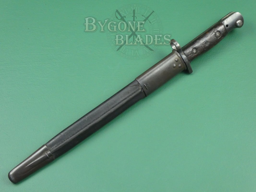 The bayonet is complete with its leather scabbard with steel locket and chape. The scabbard is in very good condition. The leather is strong and the stitching is intact. The steel locket and chape retain their original finish. The bayonet sheathes and draws smoothly and is held firmly within the scabbard.