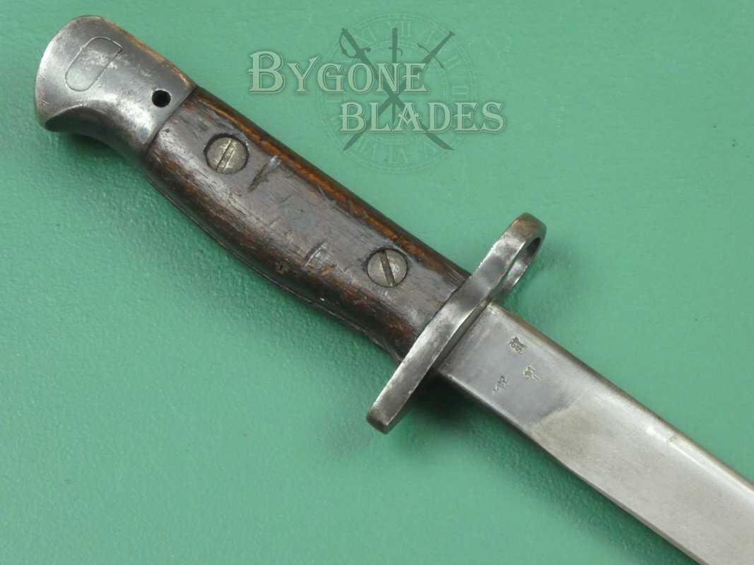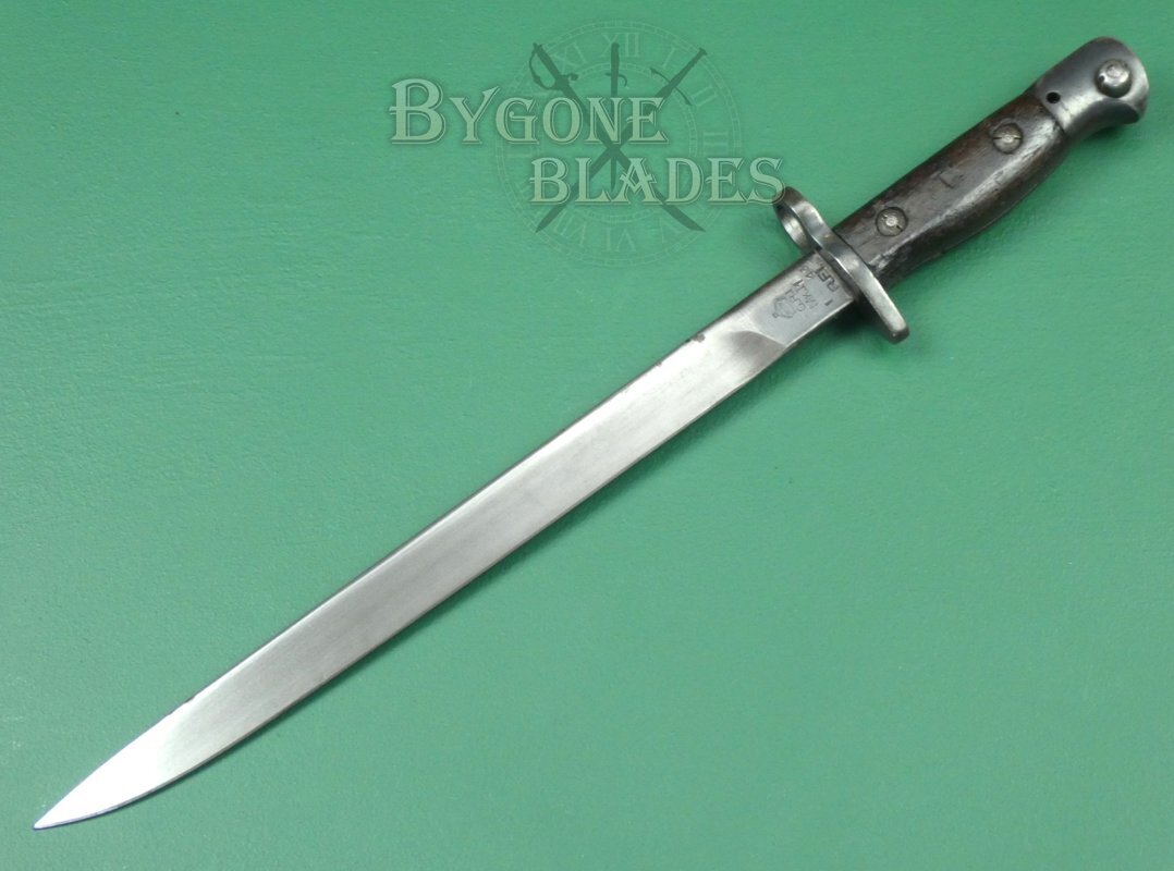 This Indian No.1 Mk II pattern bayonet was made at the Rifle Factory in Ishapore in 1943. The Mk II was a newly made bayonet as opposed to being a conversion. The only difference between the Mk II and Mk II* is the upper false edge on the MkII*.