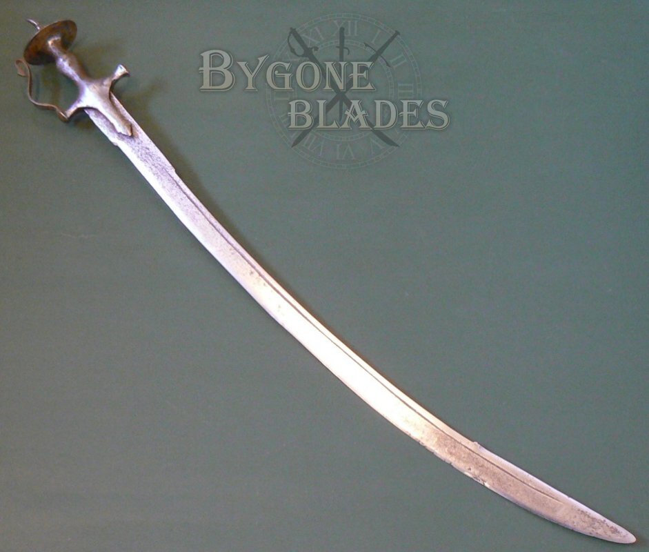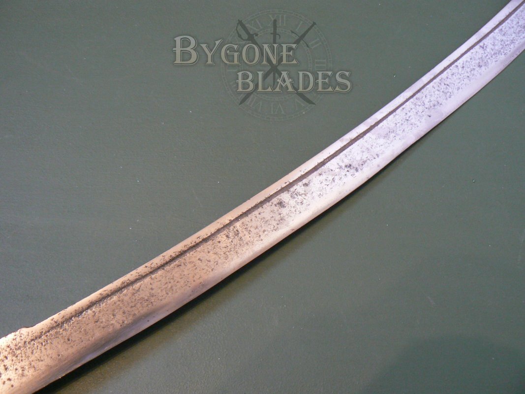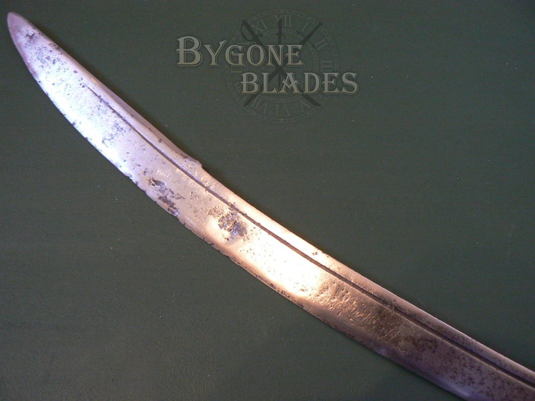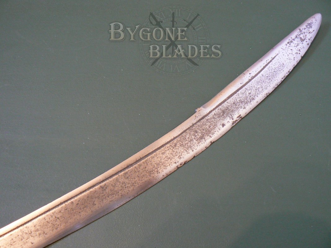 The curved steel blade has a thin single fuller on both sides. There is almost no taper to the flat spine. The blade is sharp along its length and the top 18 cm of the draw-back edge is also sharpened. The blade has been polished and is in overall good condition with areas of mild pitting and speckled, age related tarnish.