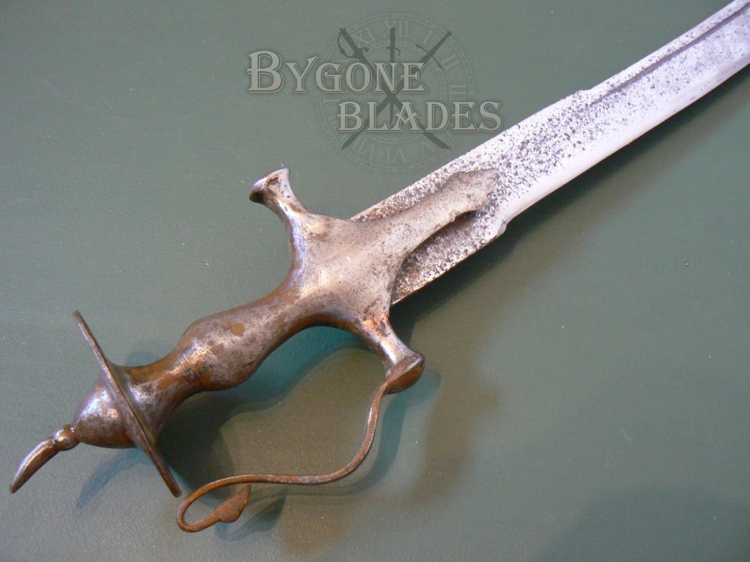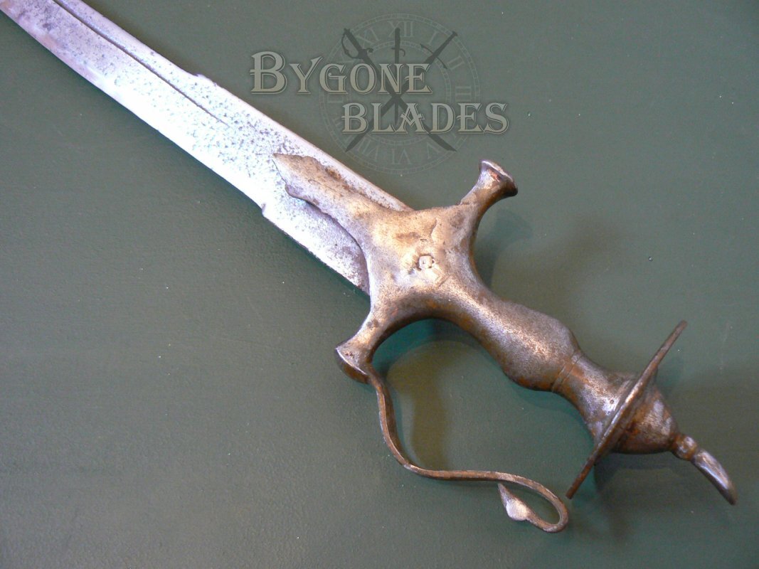 The steel hilt is of baluster form with domed finials to the crosspiece and a recurved knuckle guard. The hilt has long, decorative languets and the disk pommel is finished with a radial sun disk and spiked skull crusher.