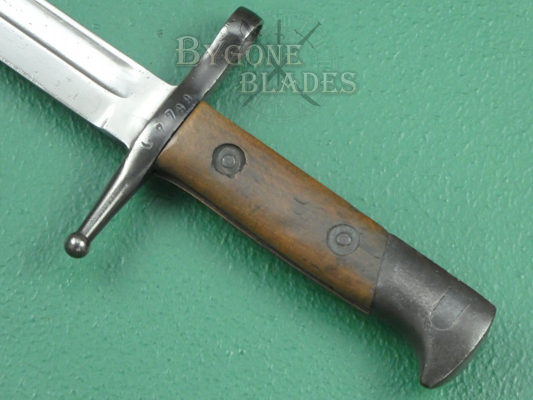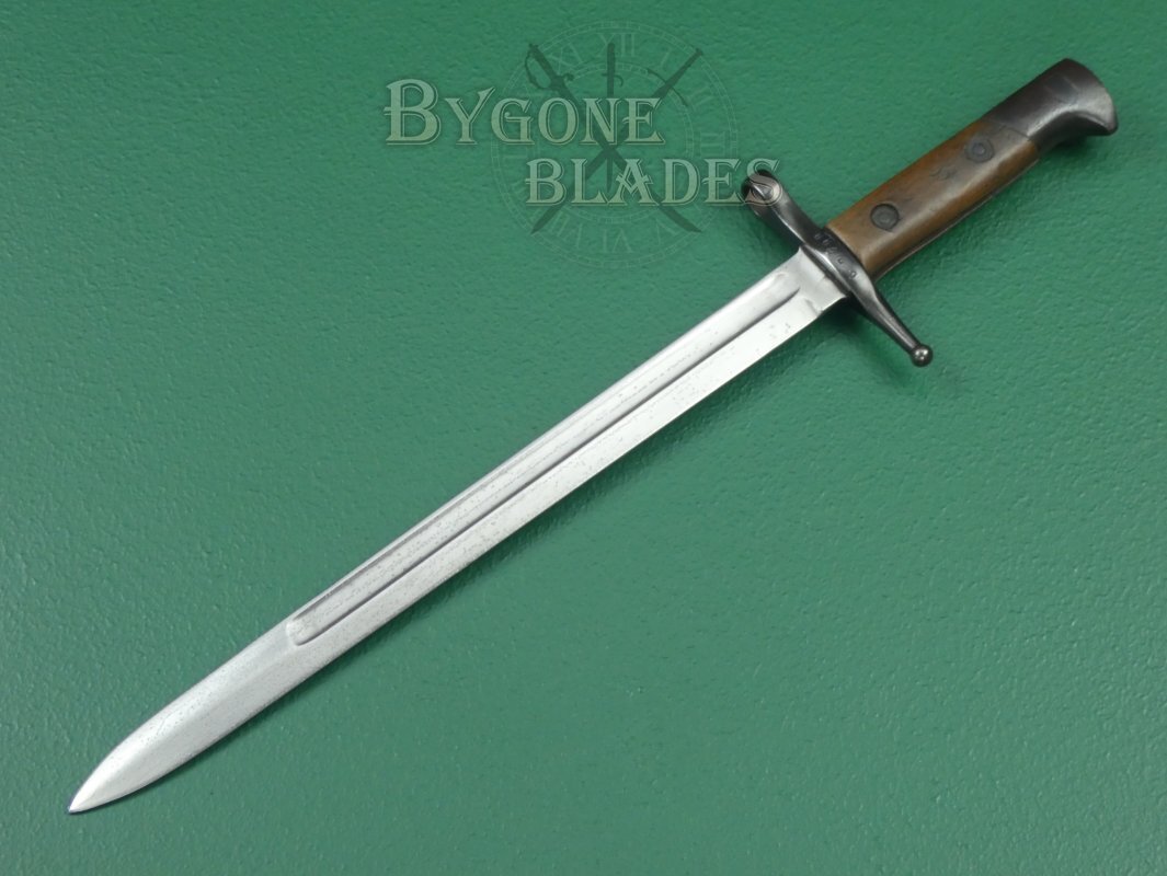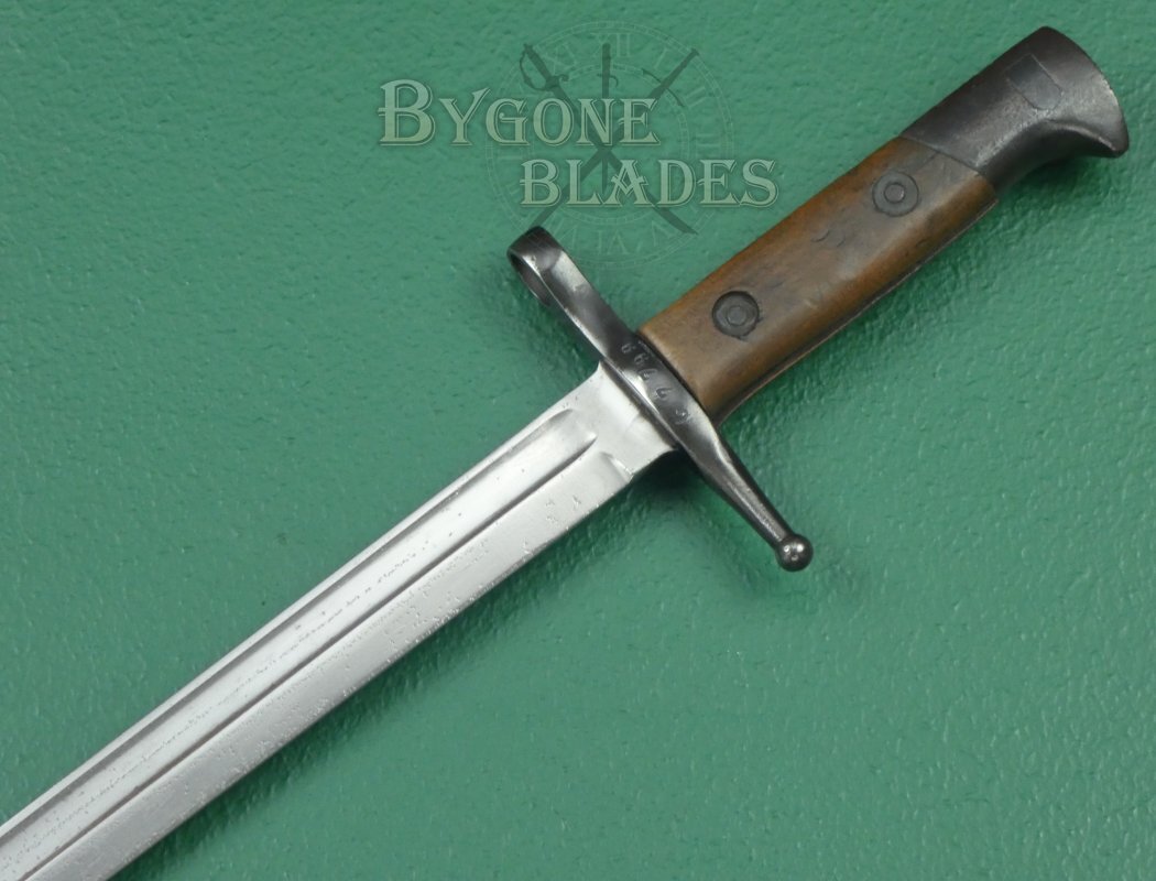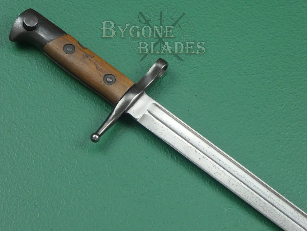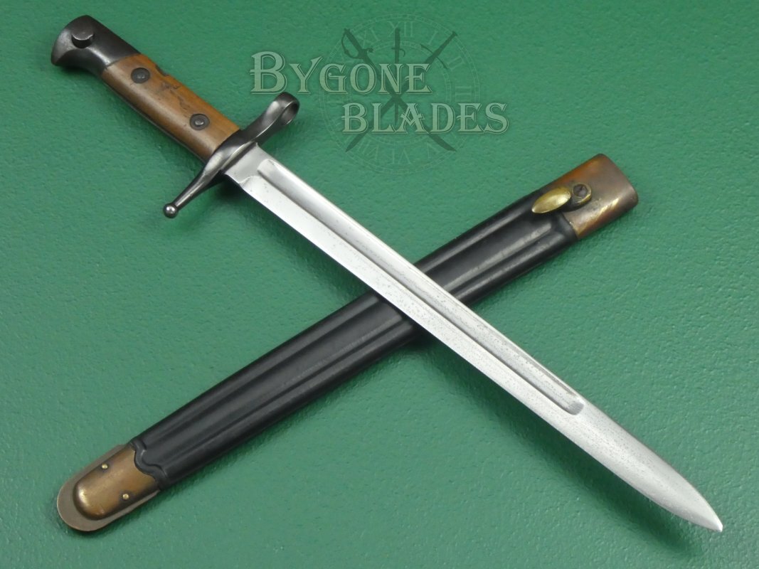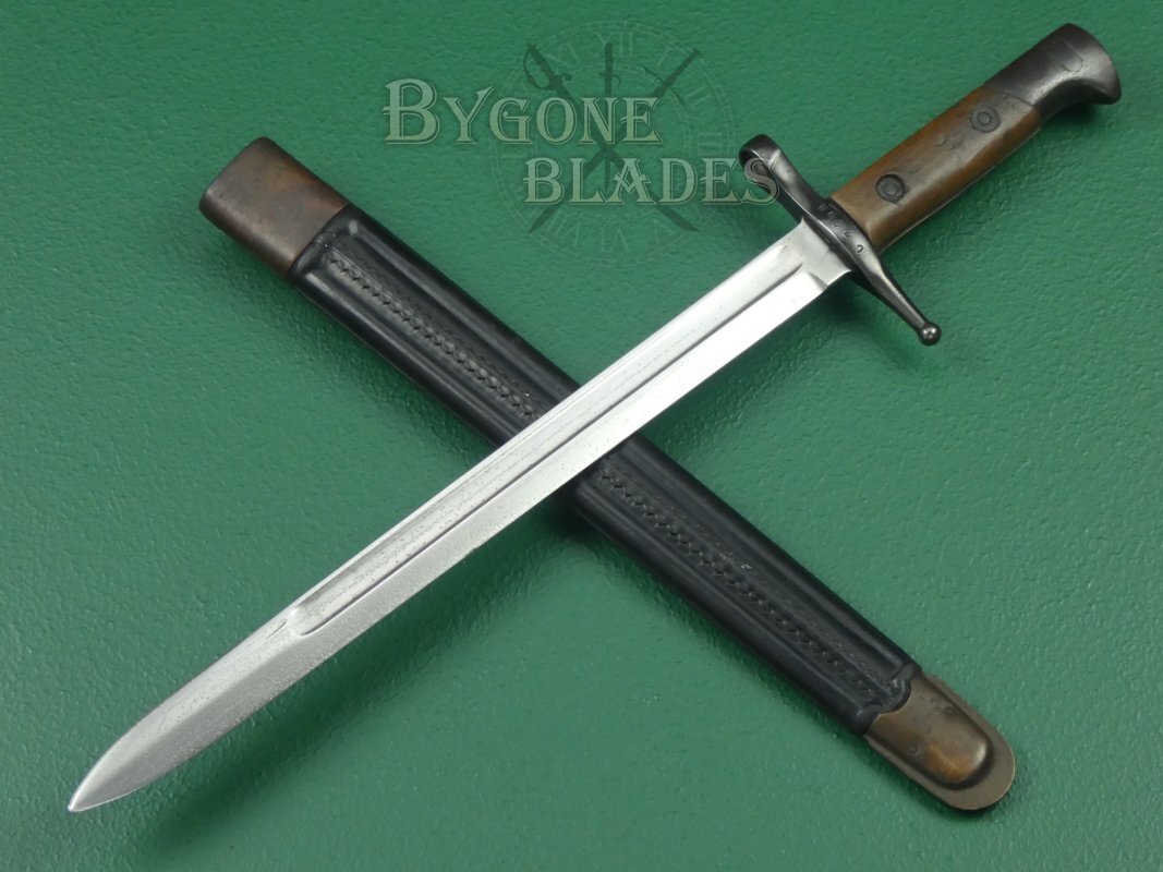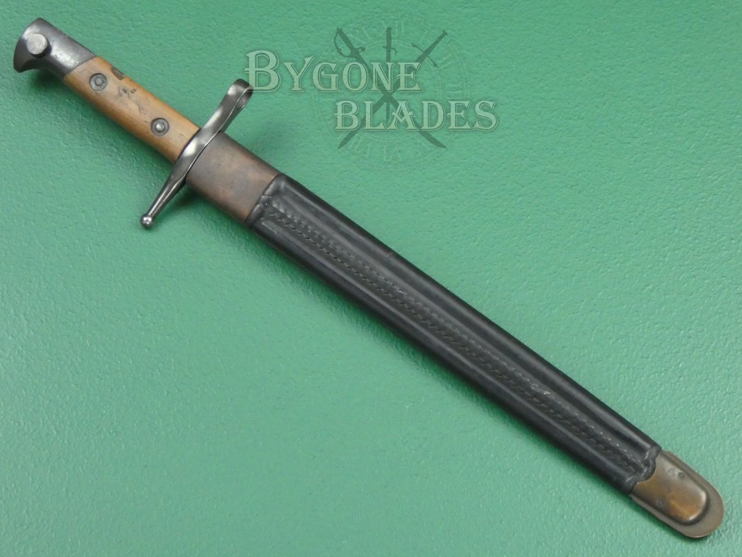 The bayonet is complete with its fluted leather scabbard with brass locket and chape. The scabbard is in very good condition. The bayonet sheathes and draws smoothly and is held firmly within the scabbard.