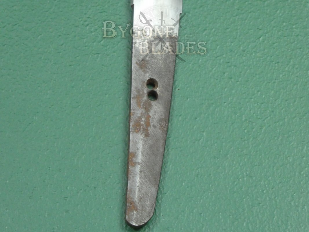 The wakizashi blade is in poor polish with delamination in a couple of places and spots of pitting and tarnish along the edge. There are scratches and age-related marks along the blade. If this were a European sword blade it would be described as being in reasonable condition for its age, but for a traditional Japanese wakizashi, the delamination, tarnish and pitting mean that its condition is considered poor.