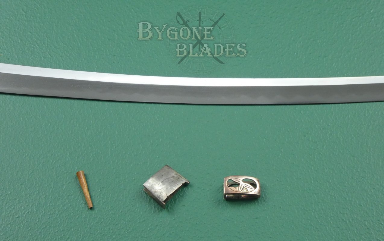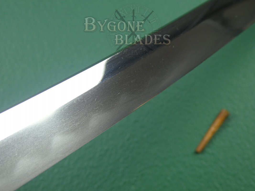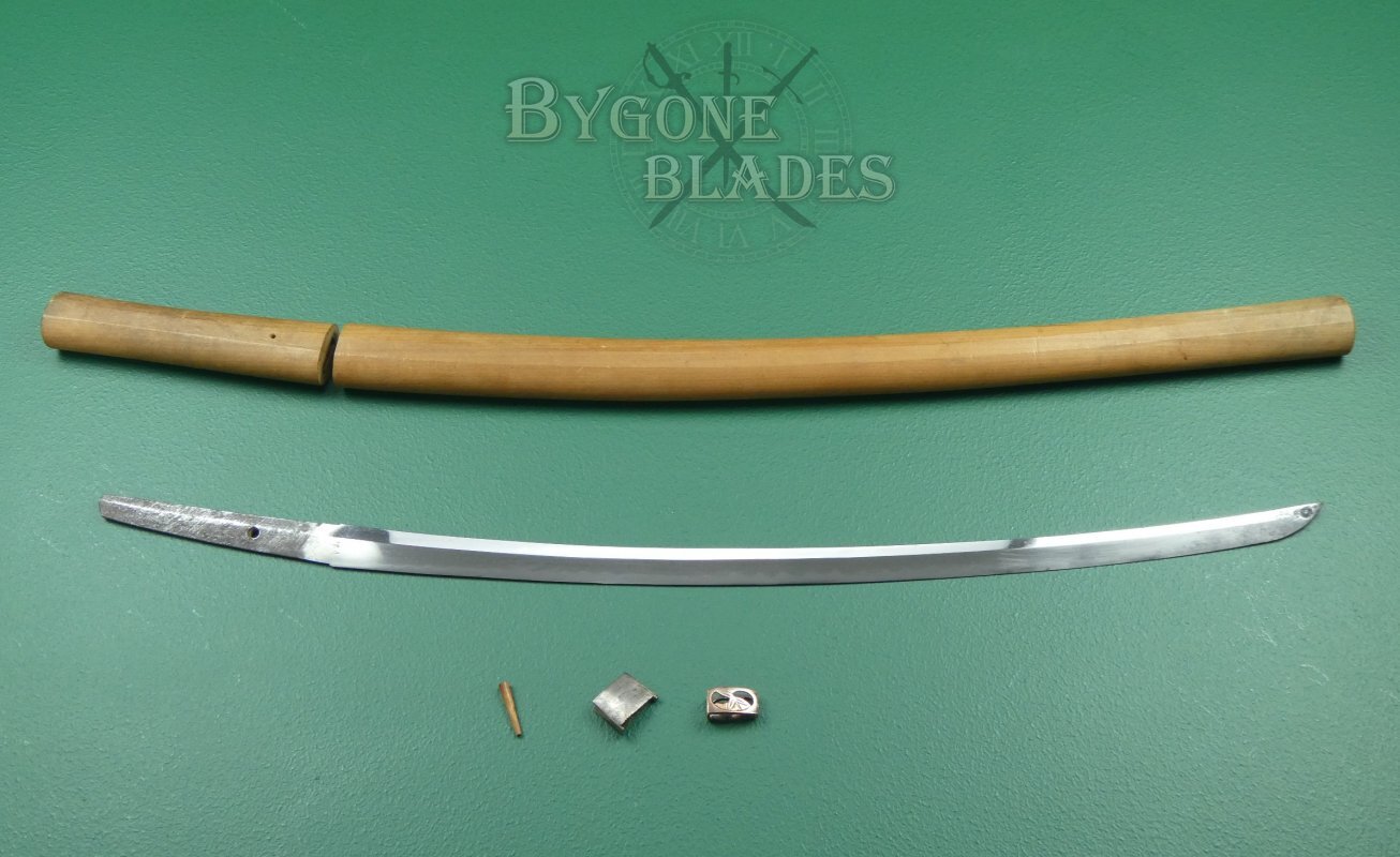 The blade is in a reasonable state of original polish with marks and tarnish consistent with age and use. A professional re-polish will remove this. There is corrosion and pitting on one side of the kissaki and to remove it will require that the kissaki be re-shaped.
