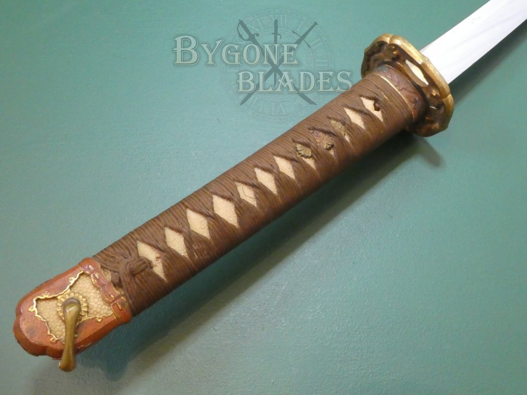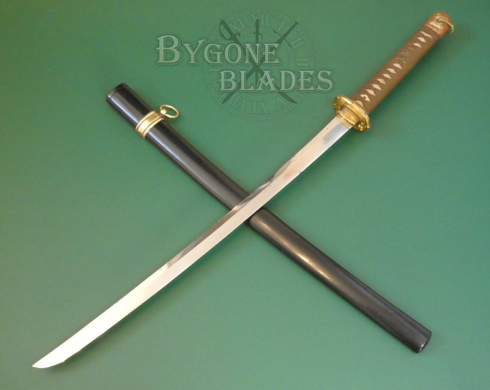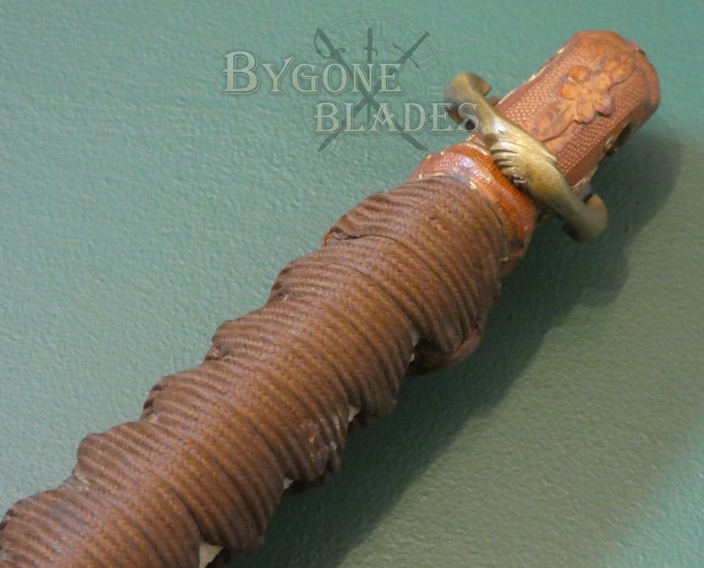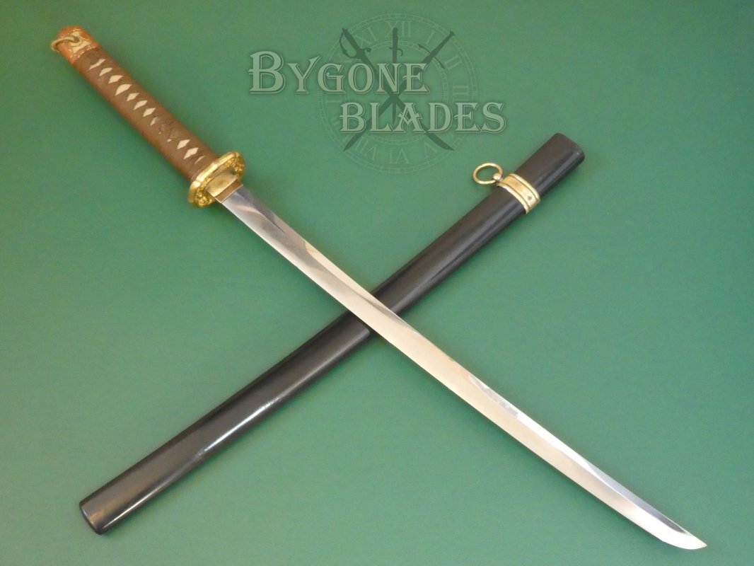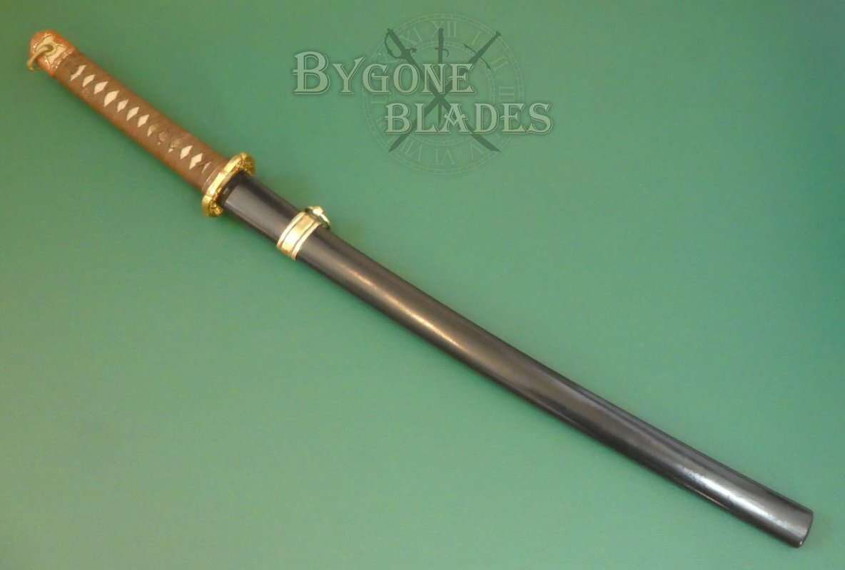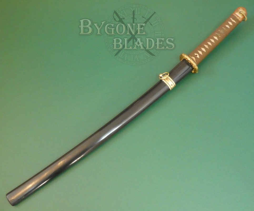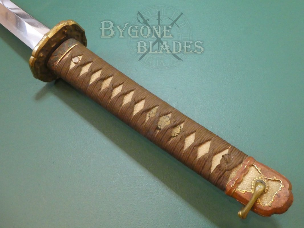 This is a rare WW2 Japanese pilot or tank officer’s short sword (wakizashi). Pilots and tank officers worked in confined spaces so were permitted to carry shorter, non-regulation length swords. It is likely that this wakizashi belonged to an officer from a family with Samurai heritage. The beautiful heirloom blade is old. The tang (nakago) is unsigned but the patina indicates that the blade is Edo period or earlier.