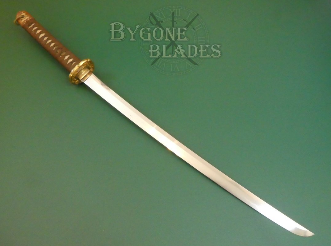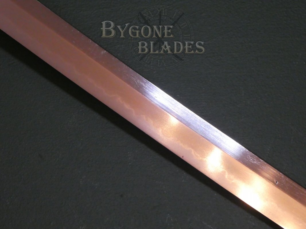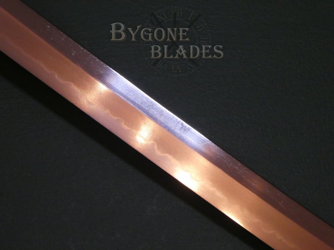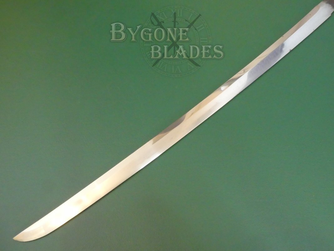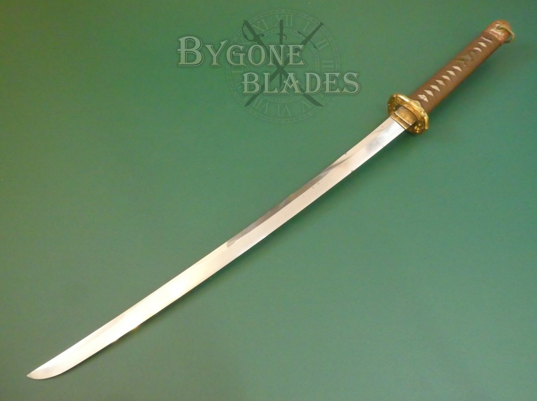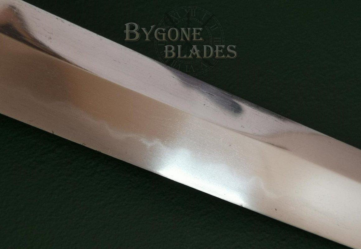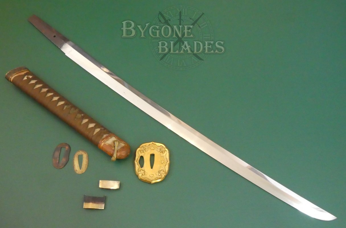 This is a rare WW2 Japanese pilot or tank officer’s short sword (wakizashi). Pilots and tank officers worked in confined spaces so were permitted to carry shorter, non-regulation length swords. It is likely that this wakizashi belonged to an officer from a family with Samurai heritage. The beautiful heirloom blade is old. The tang (nakago) is unsigned but the patina indicates that the blade is Edo period or earlier.