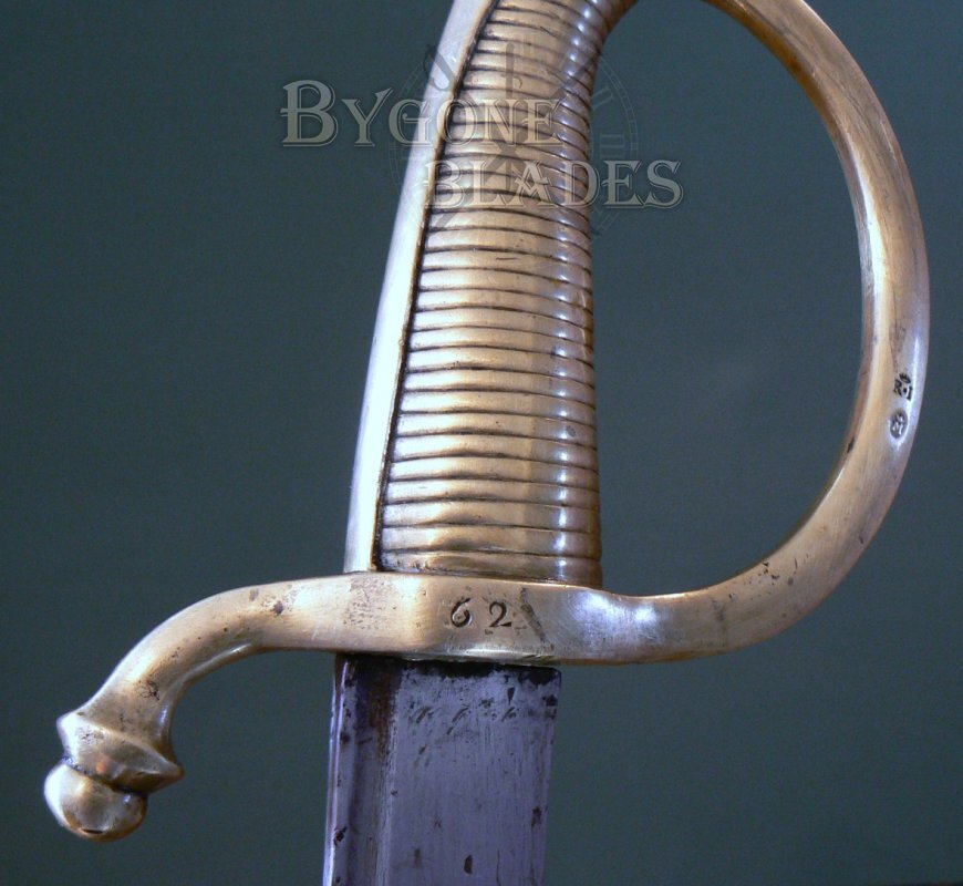 The solid brass hilt has the 36 ribs and trumpet quillion of a regulation French AN IX briquet. The cross-piece is stamped with the rack number “62.” French swords of the 1st Empire had no regimental marking, only a rack/weapon number.