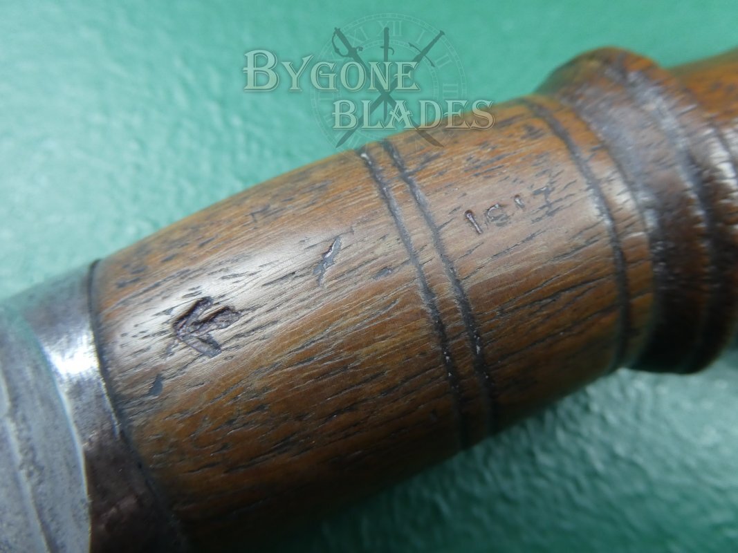 The hardwood grip is in good condition and is stamped with a Broad Arrow and the date 1917. The tang is peened through the oval pommel. The hilt has carved ridges and flares to a broad oval at the base allowing the user a very good grip.
