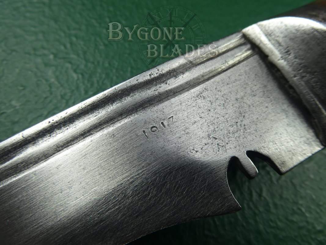 The 312mm blade has an 7mm thick, ridged spine narrowing gradually to the point and is 46mm wide at the belly. A short, double fuller runs below the spine and the blade is stamped with the date, 1917. The blade is in excellent condition and sharp.