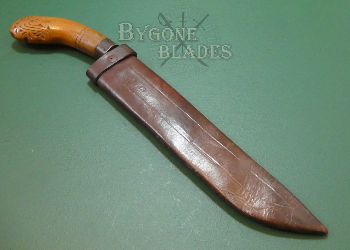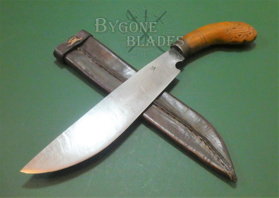 The Bolo is a predominantly cutting and chopping knife used in the Philippines and has a thick, leaf-shaped blade. The bolo began life as a farming tool but its effective use in numerous conflicts, including the Philippine Revolution, World War One and World War Two, to name but a few has given it huge cultural significance. This bolo is of WW2 vintage and wears a modified American V44, WW2 survival knife scabbard.