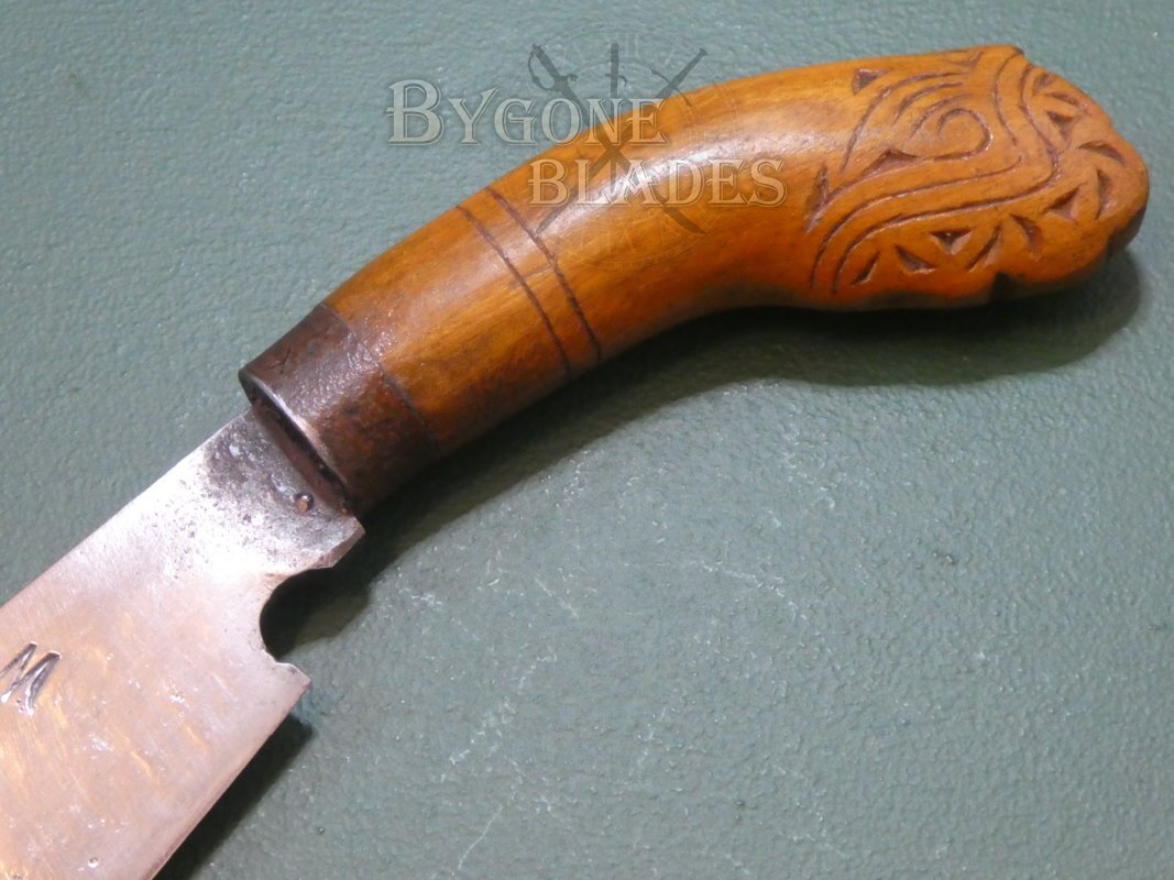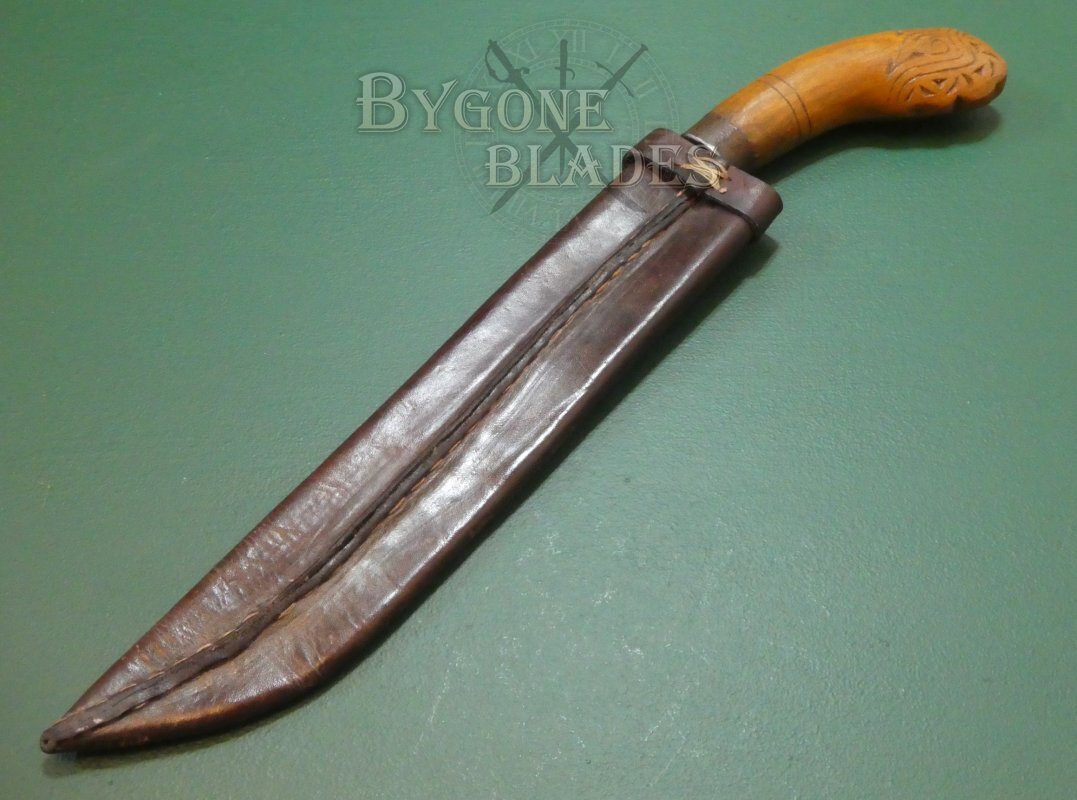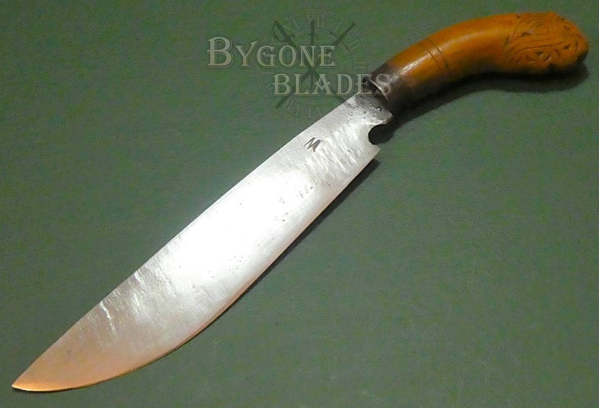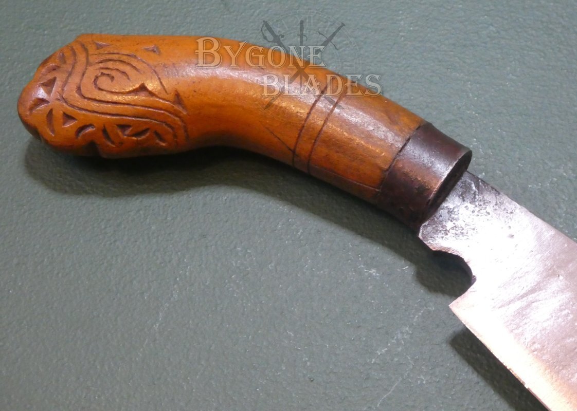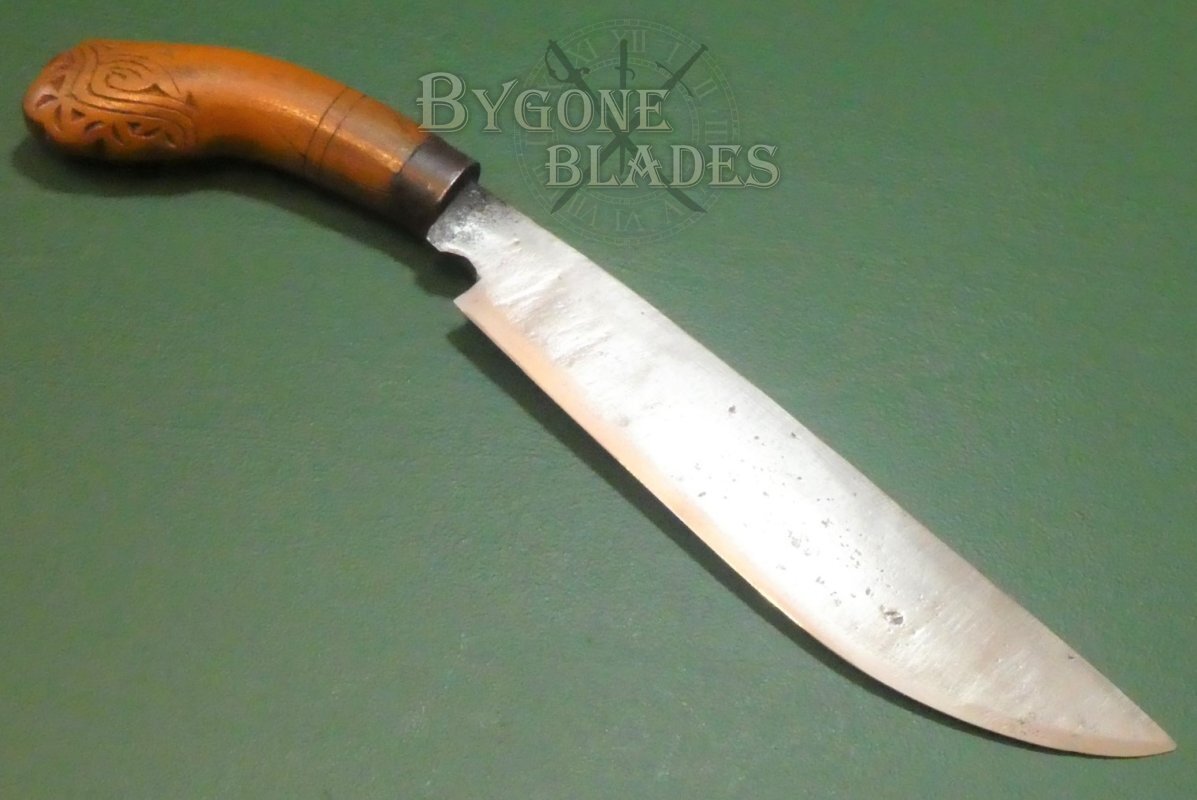 The hardwood grip has a great patina. The pommel is intricately carved with a traditional design and an iron bolster helps secure the blade firmly within the grip.