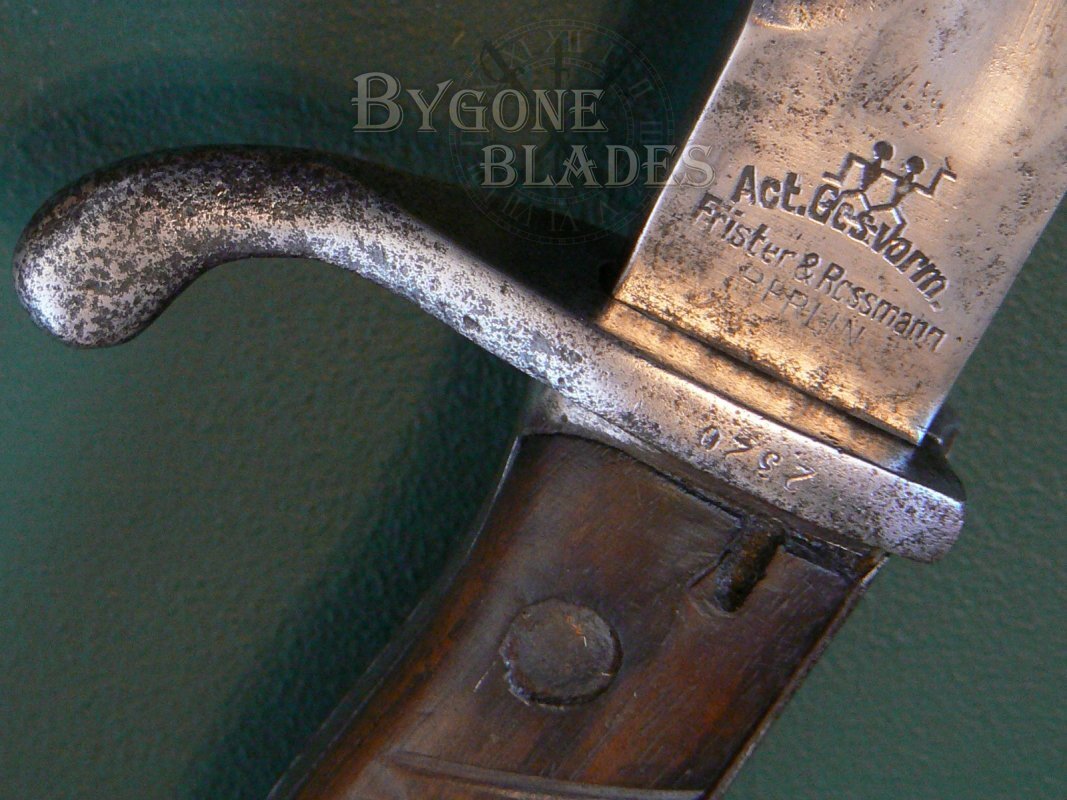 The 368mm butchers blade has a deep single fuller on both sides, the blade widening towards the point and is in good condition with age related tarnish and some shallow pitting. The blade is marked on the ricasso “Act. Gesvorm,” over “Frister & Rossmann” over “Berlin.” This maker’s mark has been stamped over the Heinkel factory twin mark. It is likely that the original bayonet was made by the Hienkel factory and was later re-worked to conform to the specifications of the second pattern by Frister & Rossmann who instead of using the blank obverse ricasso decided to over stamp the Heinkel mark. The spine is stamped with the imperial “W”, a waffenampt inspection mark, and the date “17” for 1917.