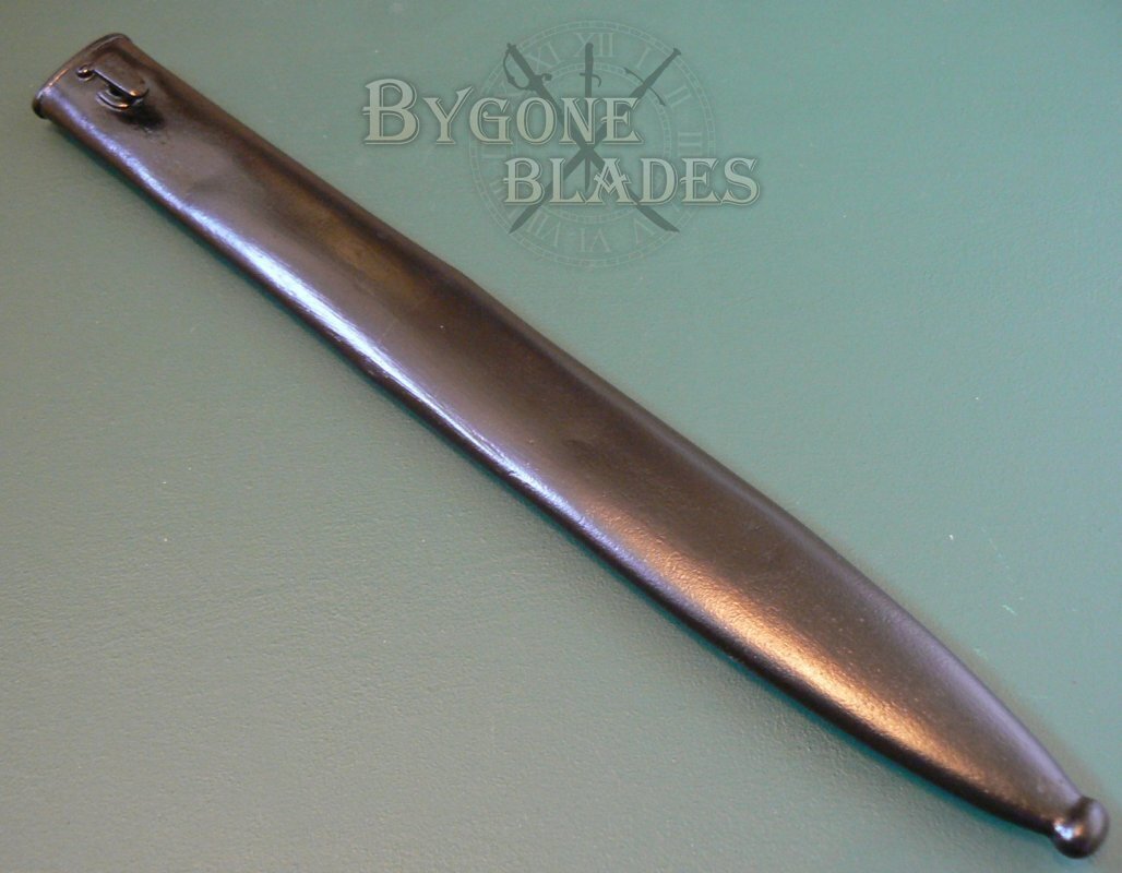 The steel scabbard has been repaired. On inspection, it looks as though some dents have been filled to smooth out the surface and the scabbard has been painted. The repair work is reasonable and the bayonet sheathes and draws smoothly and is held firmly within the scabbard.