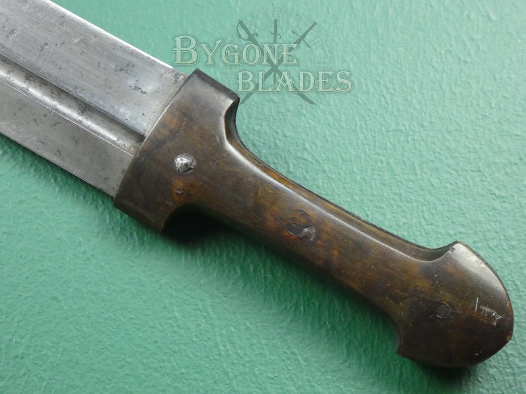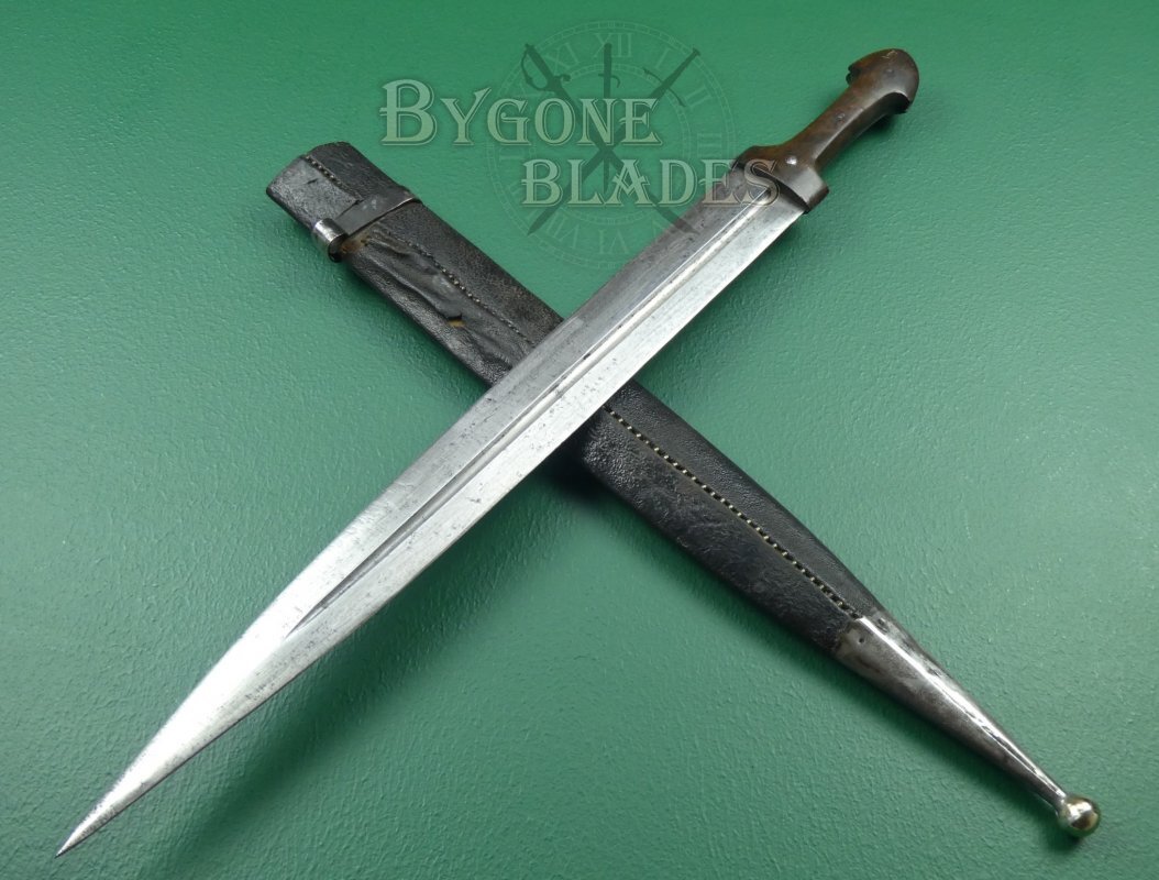 The 467mm double-edged blade has a lenticular cross section with a single off-set fuller on each side. The blade is 50mm wide at the base and tapes to a needle sharp spear point. The blade is faintly etched on one side with a maker’s panel and scrollwork. Originally the etching was gilded, the base of the blade retaining its original gilt. The blade is in good condition with use related scratches and patches of tarnish. The edges remain very sharp.