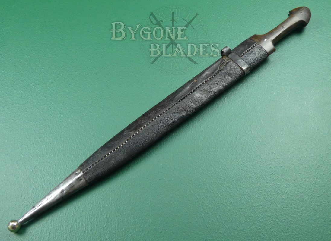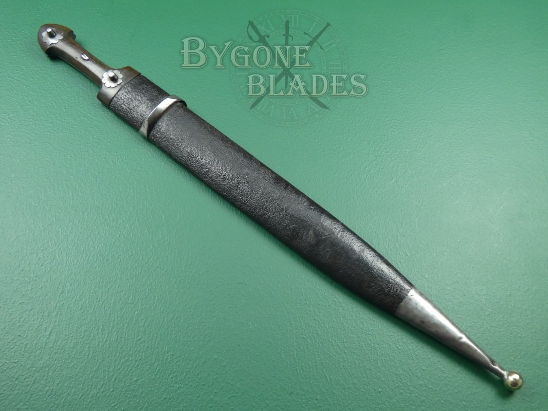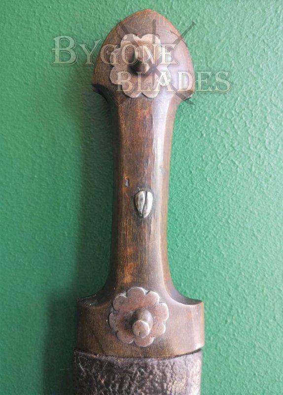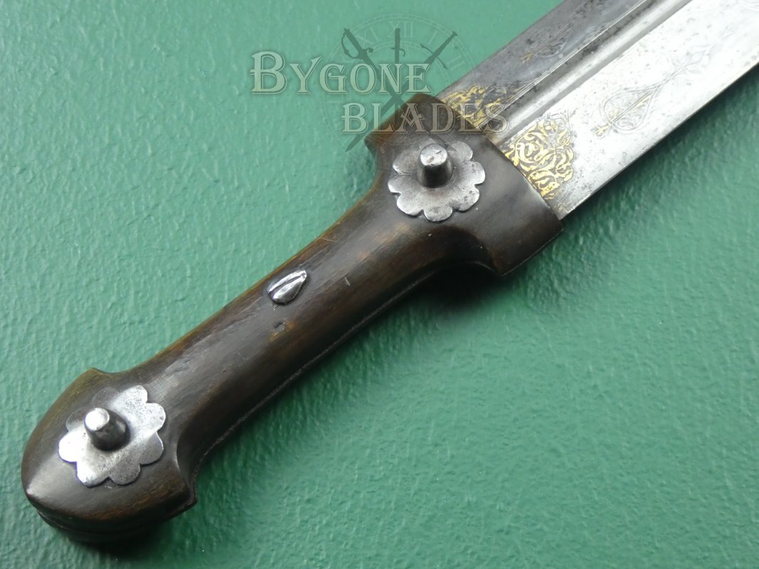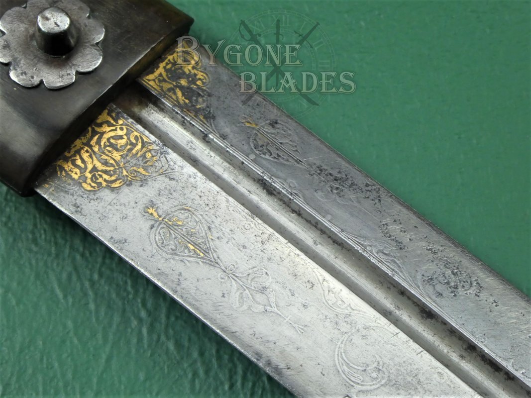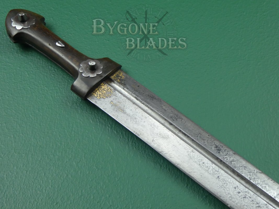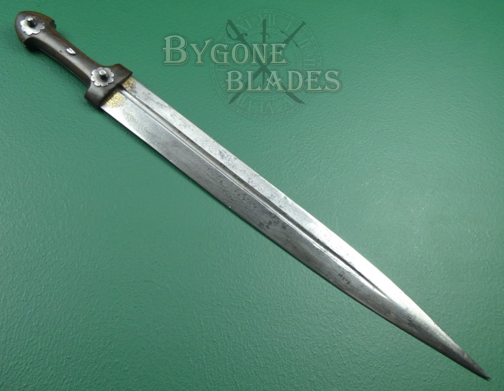 A variety of blade lengths and widths are found amongst kindjal. Late 19th Century and newer examples tend to be more like daggers while older examples are most definitely short swords. The kindjal is believed to be based on the ancient Roman gladius and it certainly bears many similarities. Its exact origins are debated but it is likely to have originated in the norther Caucasus or Persian Gulf area. Much variety in the degree and type of decoration can also be seen amongst kindjal. The plainer form of the kindjal tends to be associated with those from Russia while those from Georgia, where they are known as quama, are often decorated with gold or silver inlay along the blades. This kindjal/quama is likely to be of Georgian origin.