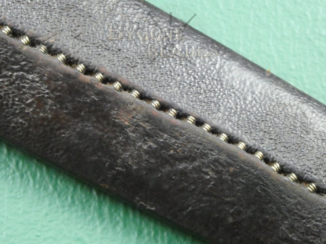 The sword is complete with is leather covered wooden scabbard with steel mounts. The seam is intact, with each stitch passing through a silvered wire coil showing great attention to detail. The steel chape of the scabbard is finished with a gilt ball. The top of the scabbard has a ridged band incorporating a loop for suspending the scabbard.