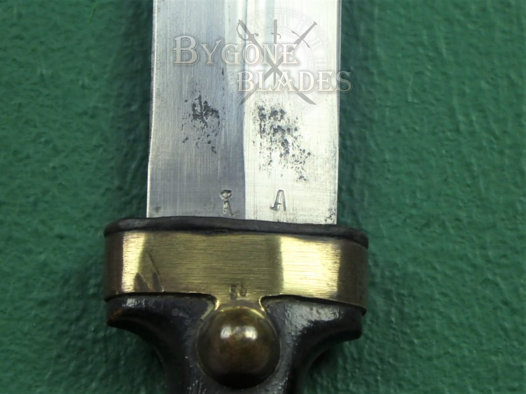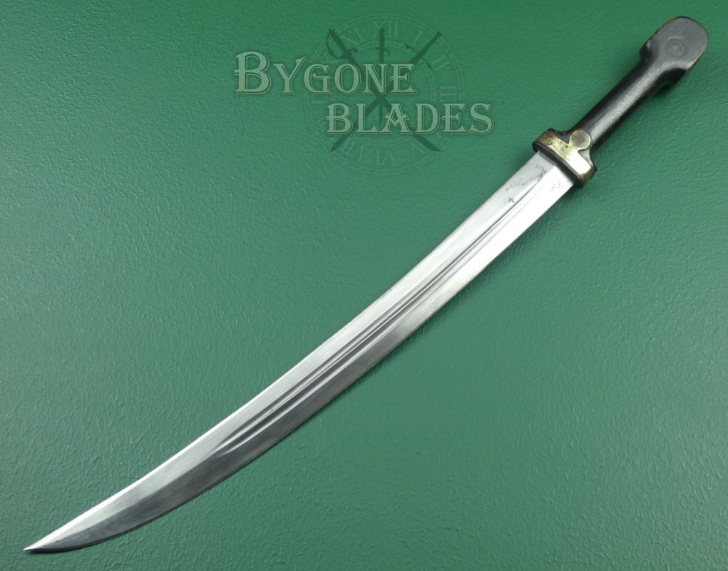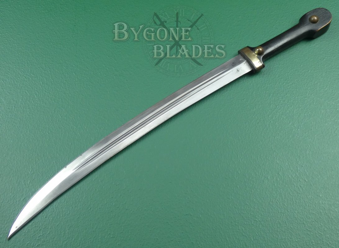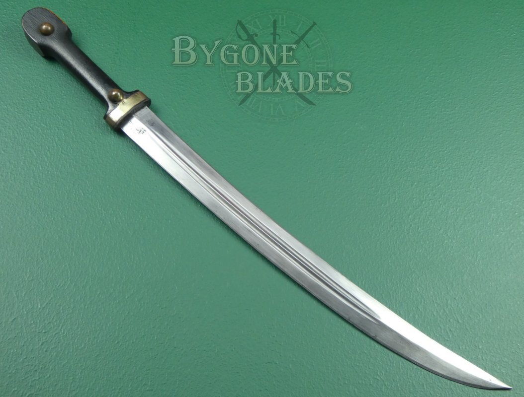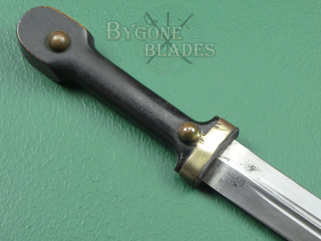 The wood and brass bound grip is in great condition with a beautiful patina to the wood. The grip scales are held in place by steel rivets capped on one side by brass half olives. The blade is firm in the hilt.