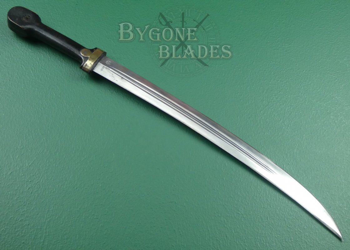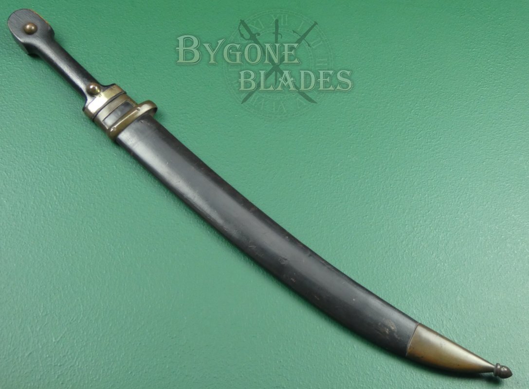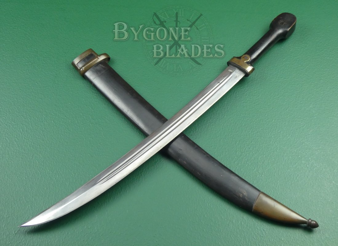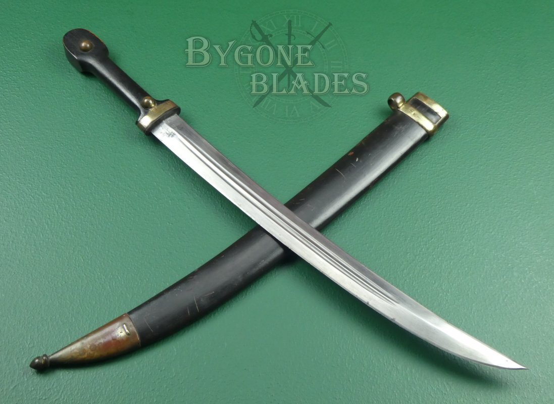 The wood and brass bound grip is in great condition with a beautiful patina to the wood. The grip scales are held in place by steel rivets capped on one side by brass half olives. The blade is firm in the hilt.