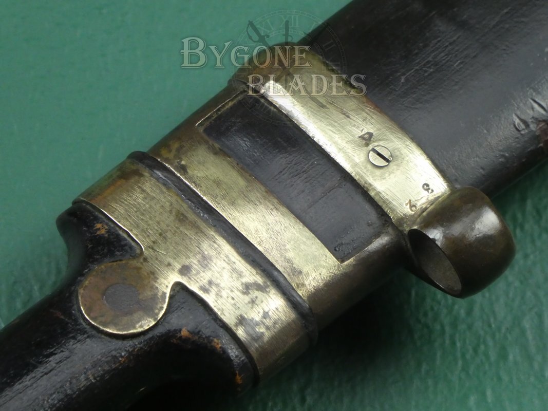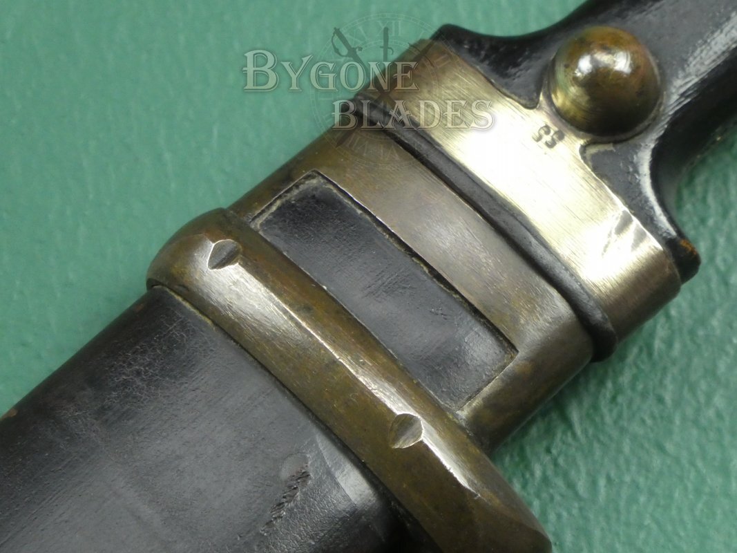The Bebut is complete with its original lacquered wooden scabbard with brass fittings. The scabbard is in excellent condition. The suspension loop band is stamped with a Zlatoust factory inspection stamp and the numeral 32. The brass chape with acorn finial is firmly in place and bears a factory inspection stamp. The sword sheathes and draws smoothly and is held firmly within the scabbard.