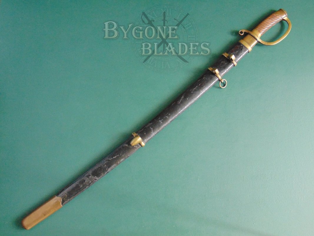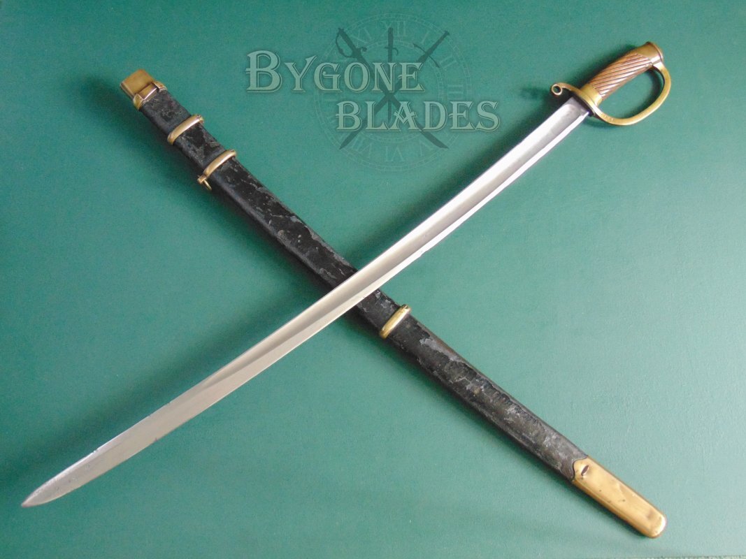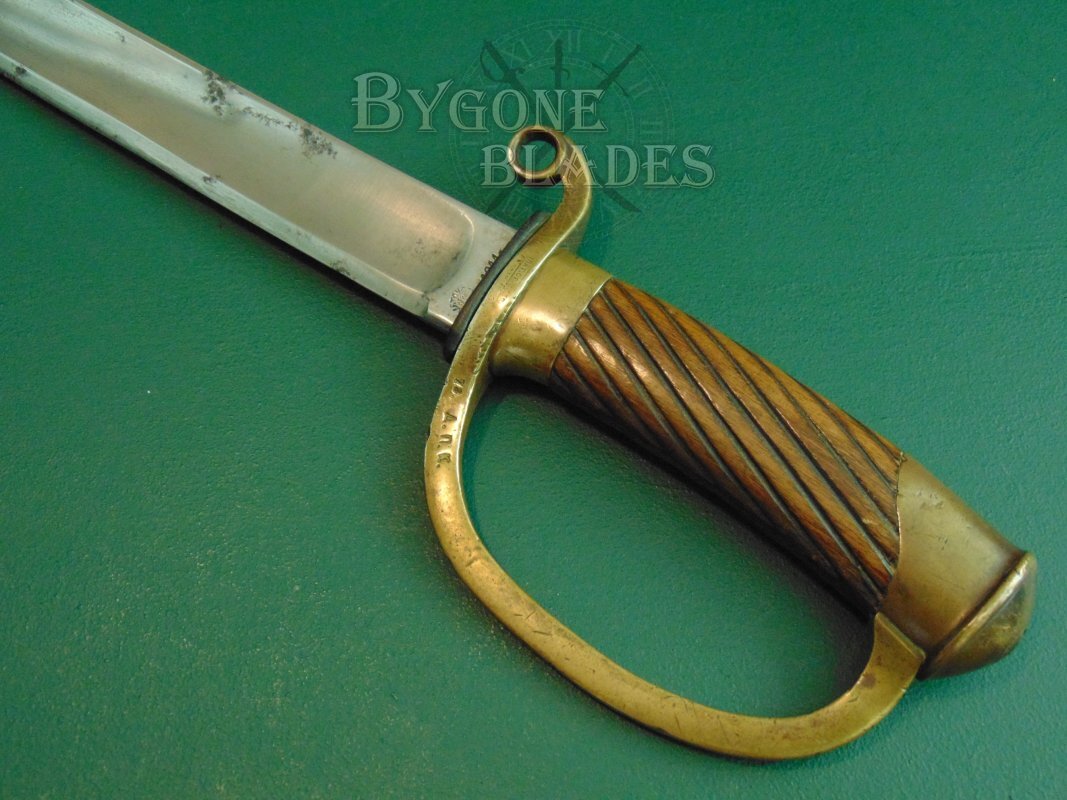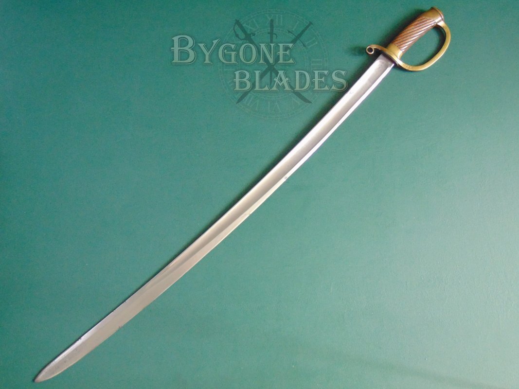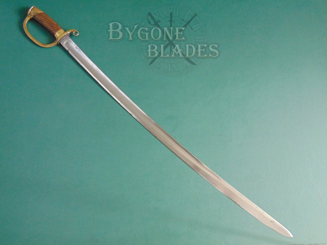 The brass and wood hilt is in very good condition, with the cross-piece of the brass knuckle bow bearing factory and inspection stamps as well as Russian unit markings. The blade is firm in the hilt.