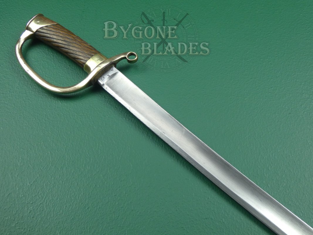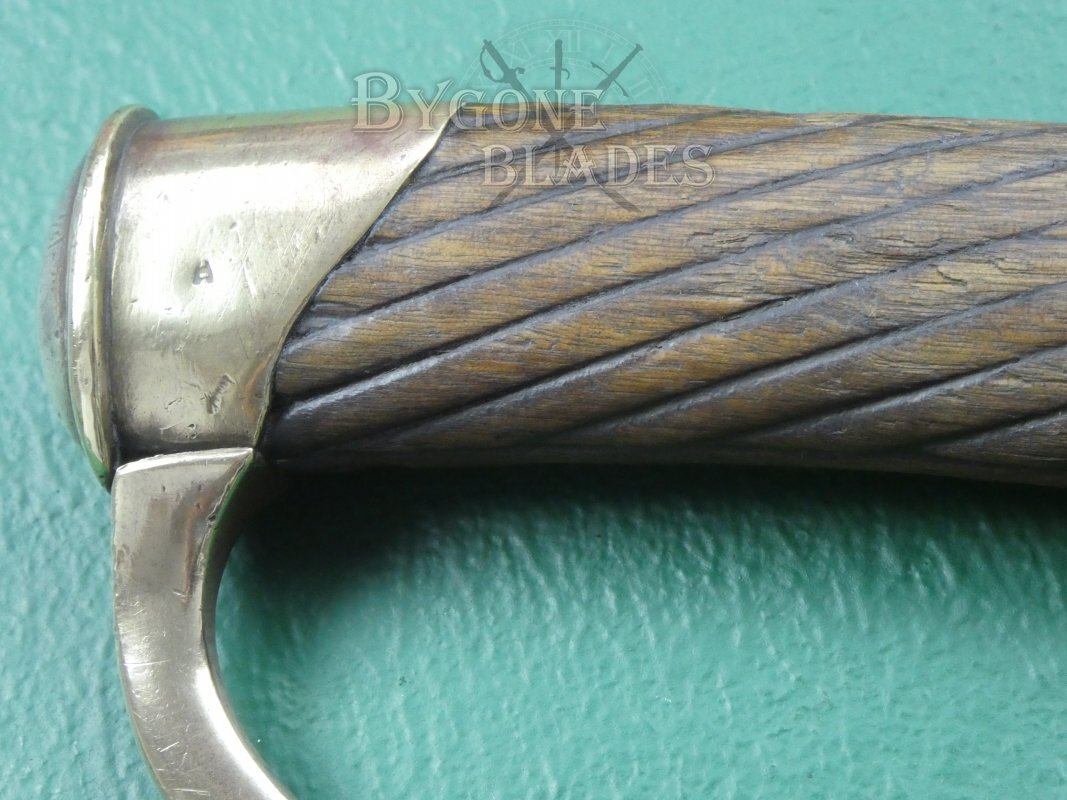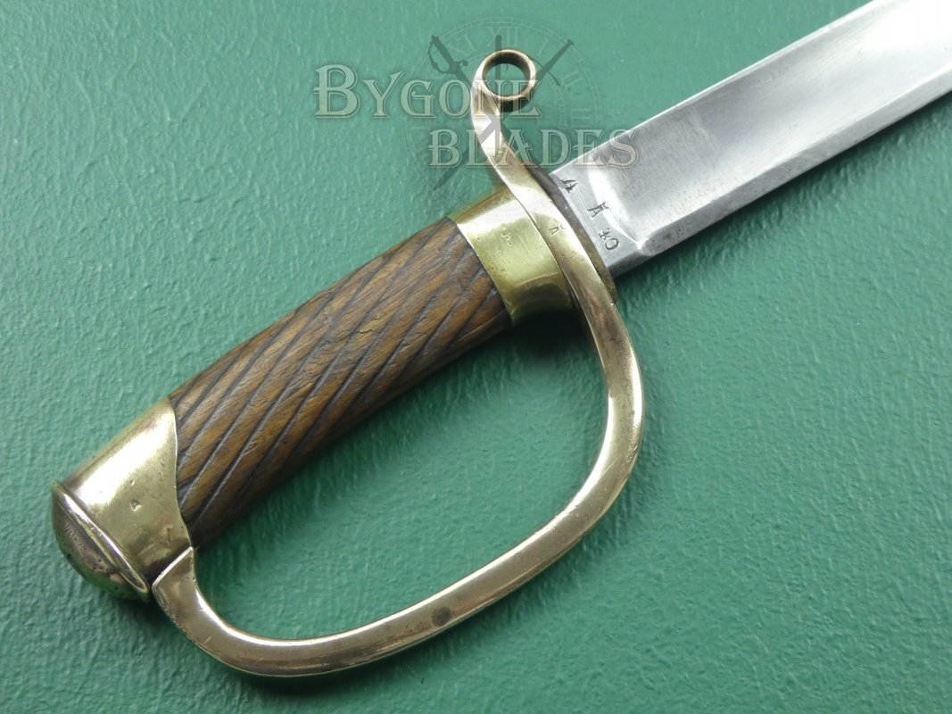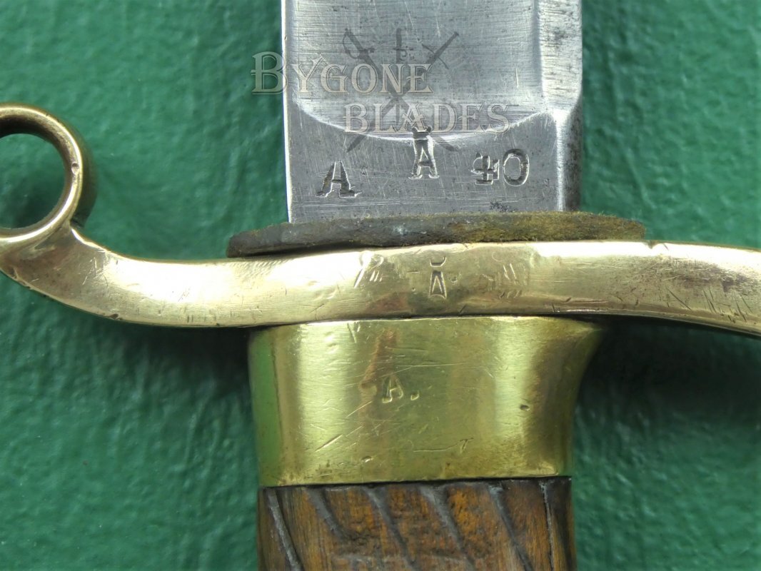 The brass and wood hilt is in very good condition. The cross-piece of the brass knuckle bow, the grip collar and the pommel all bear factory inspection stamps. The front of the D-guard is stamped with the number 57. The blade is firm in the hilt.