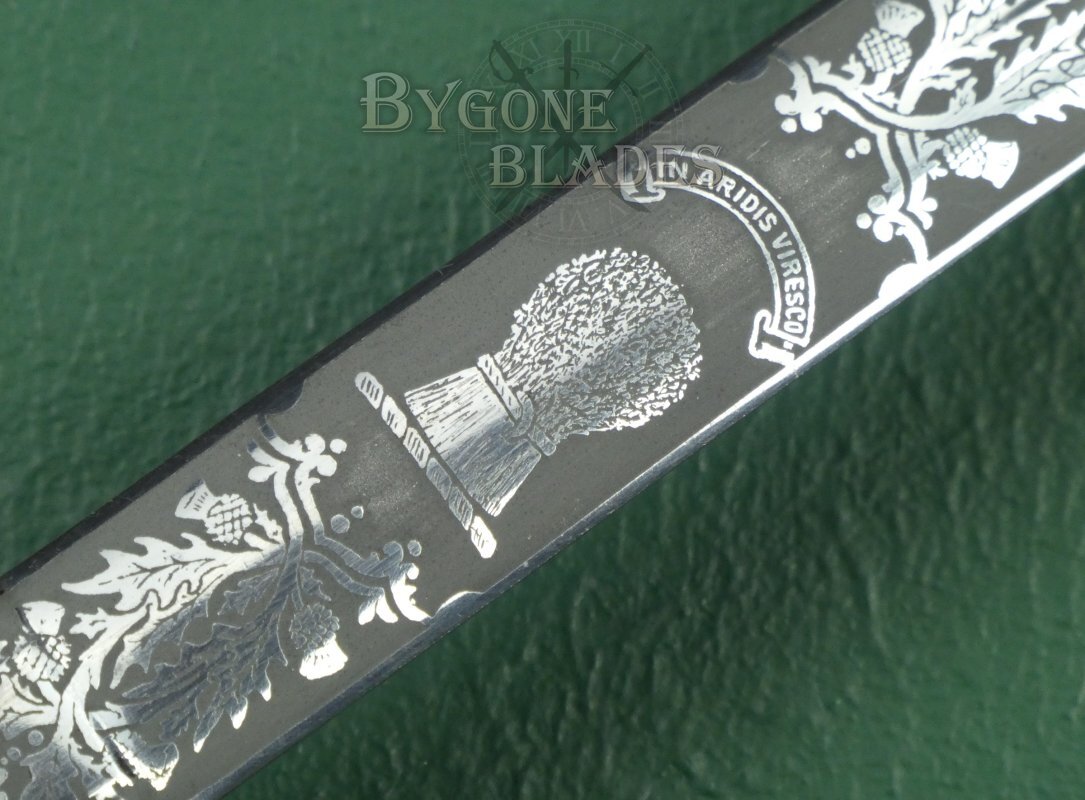 The 830mm double-edged (broadsword) blade has twin, three-quarter length fullers and terminates in a spear point. The blade is etched on a grey matt background with Scottish thistles above and below the badge of the Argyll & Sutherland Highlanders. The forte bears the armorial motto, “In Aridis Viresco,” (In dry places I grow green) the general meaning of which is “In Adversity, I Flourish,” and a heraldic crest showing a garb of wheat. I have not as yet been able to establish which family this crest belongs to.