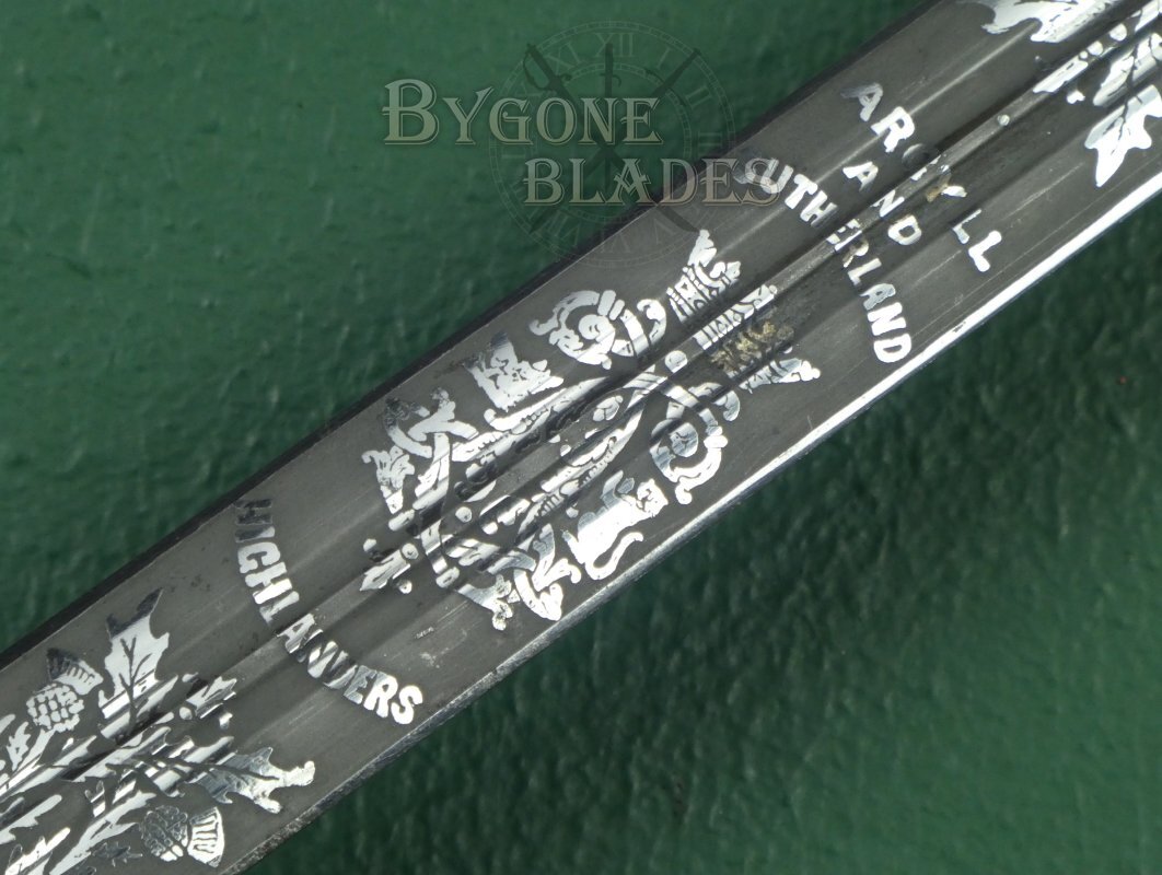 The blade is also etched with the regimental badge of the Argyll & Sutherland Highlanders and a family crest and motto. This was likely to have been a family sword that was handed down from father to son. The father probably also served in the Argyll & Sutherland Highlanders.