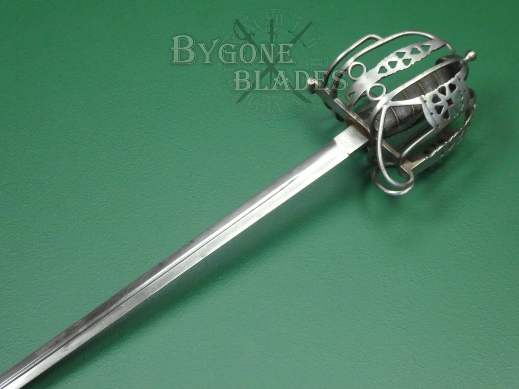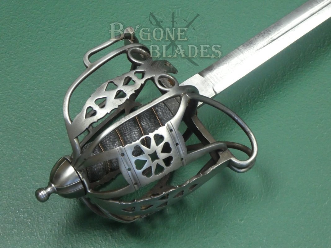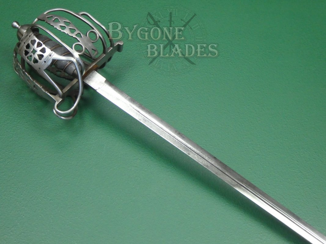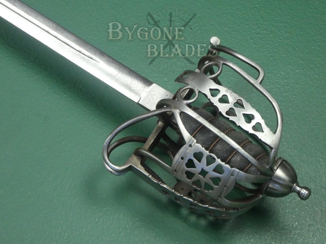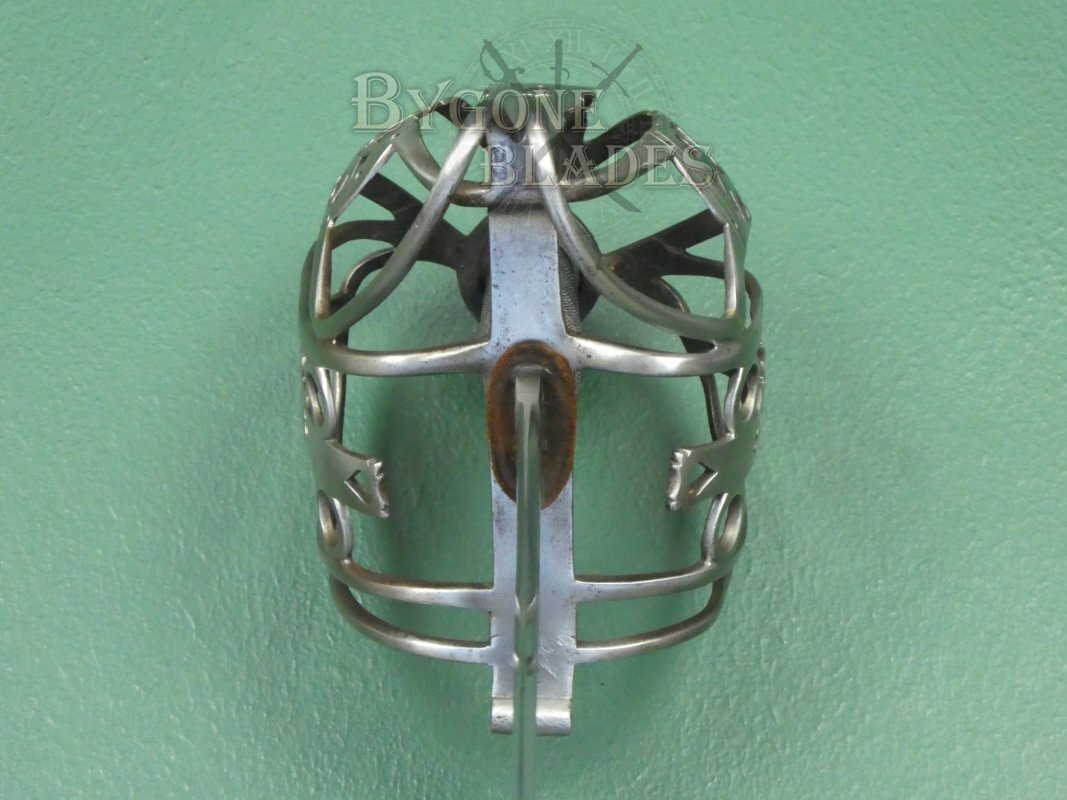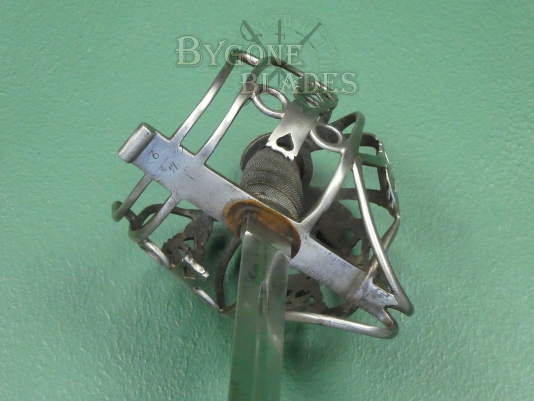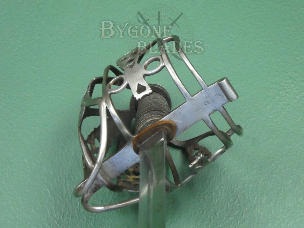 The regulation iron basket-hilt is composed of rounded bars united by heart-pierced junction plates. The shagreen wrapped grip is in good condition and the twisted copper wire is intact and tight. The blade is firm in the hilt. The front of the quillon is engraved with a letter B over the numeral, 2, suggesting that the sword was an issued weapon instead of an officer’s private purchase.