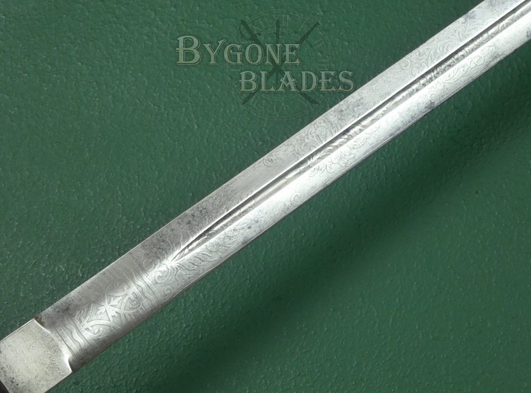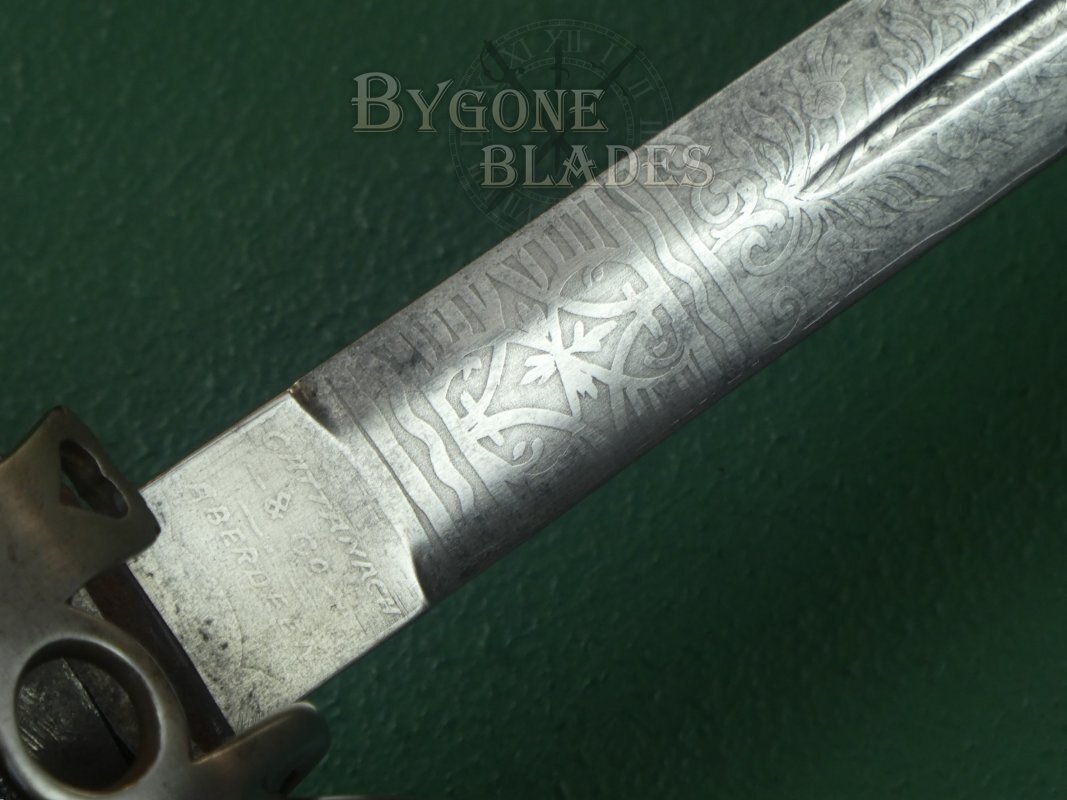 The blade is etched on the lower third with arches, foliate scrollwork and thistles. The obverse is similarly etched. The ricasso bears a Damascus star, indicating that the blade meets the required standard for a military sword. When the proof disk was invented by Wilkinson in 1845, an etched Damascus star was still used as an accompaniment to the brass disk. The obverse ricasso is etched with the cutler’s details, Cattamach & Co., Aberdeen. In 1830, Charles Cattanach was a tailor/military outfitter with a premises at 2 Ragg’s Lane, Aberdeen, Scotland.