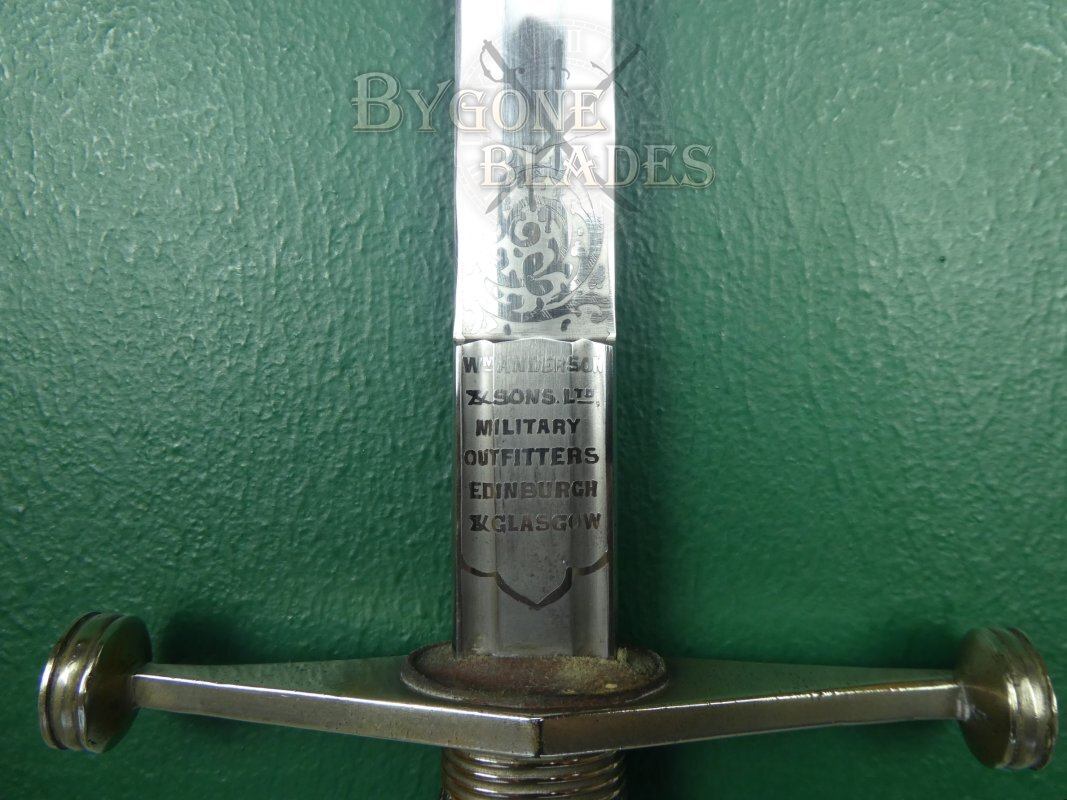The ricasso bears a brass proof disk showing the word Proved around a G. This is the proof stud of a Sheffield maker, Clement Gray. The obverse ricasso is etched with the details of the outfitters, William Anderson & Sons Ltd. Military outfitters, Edinburgh & Glasgow. The blade retains its original washer.