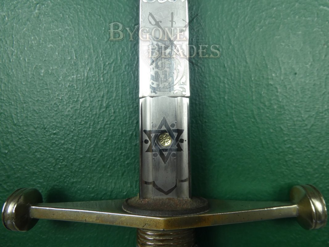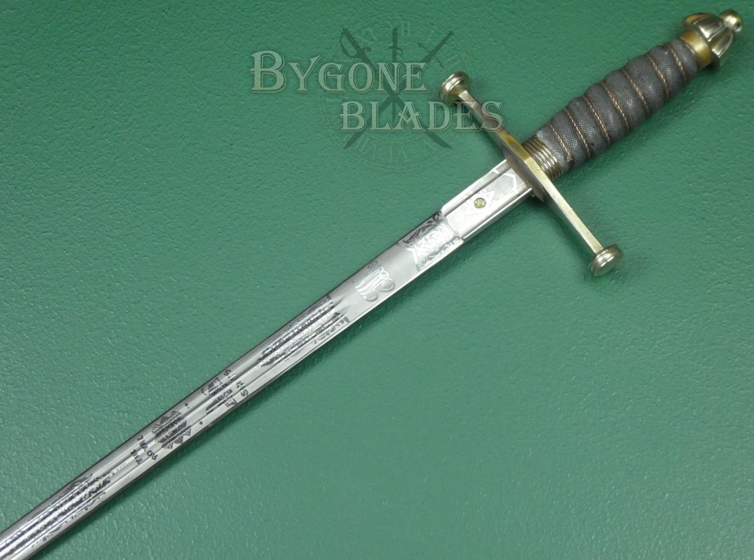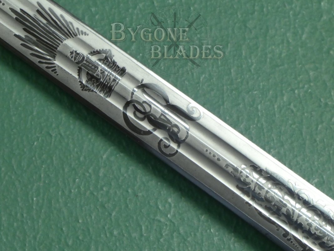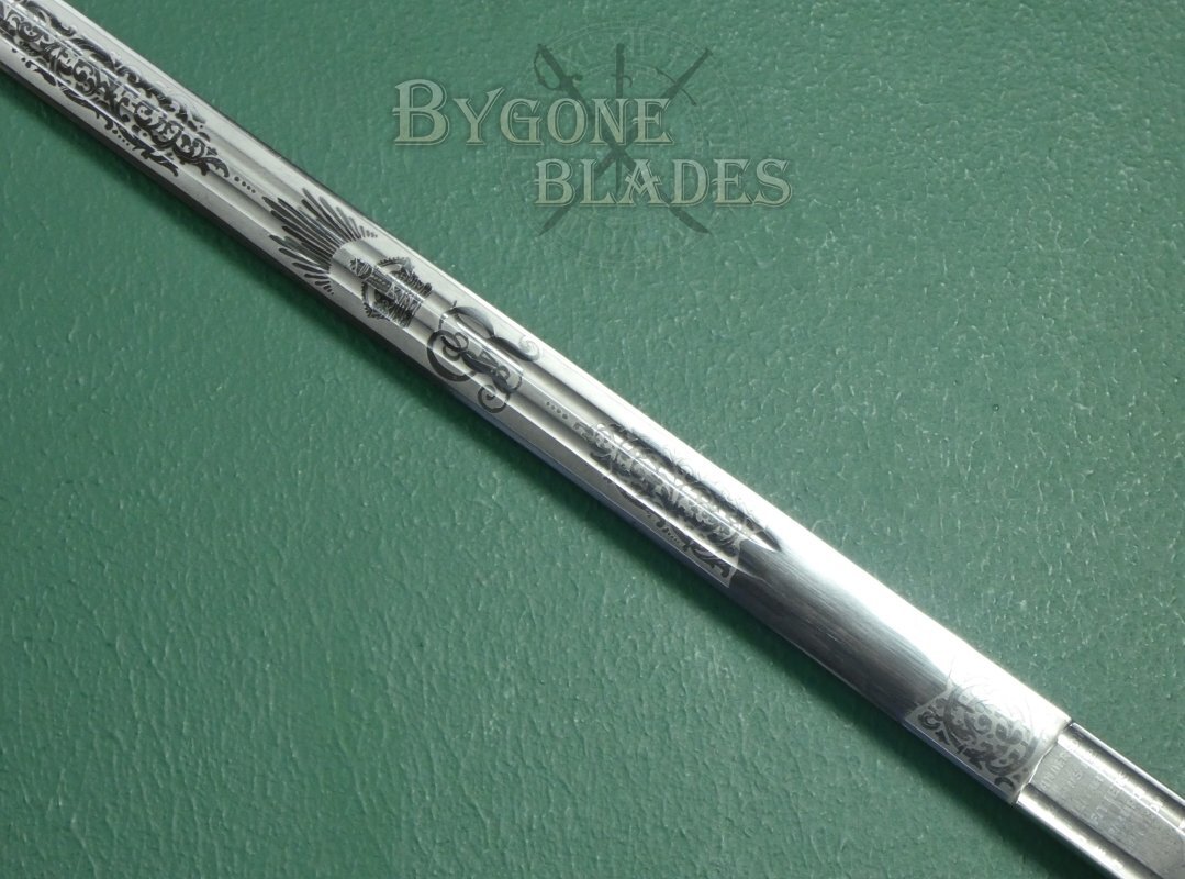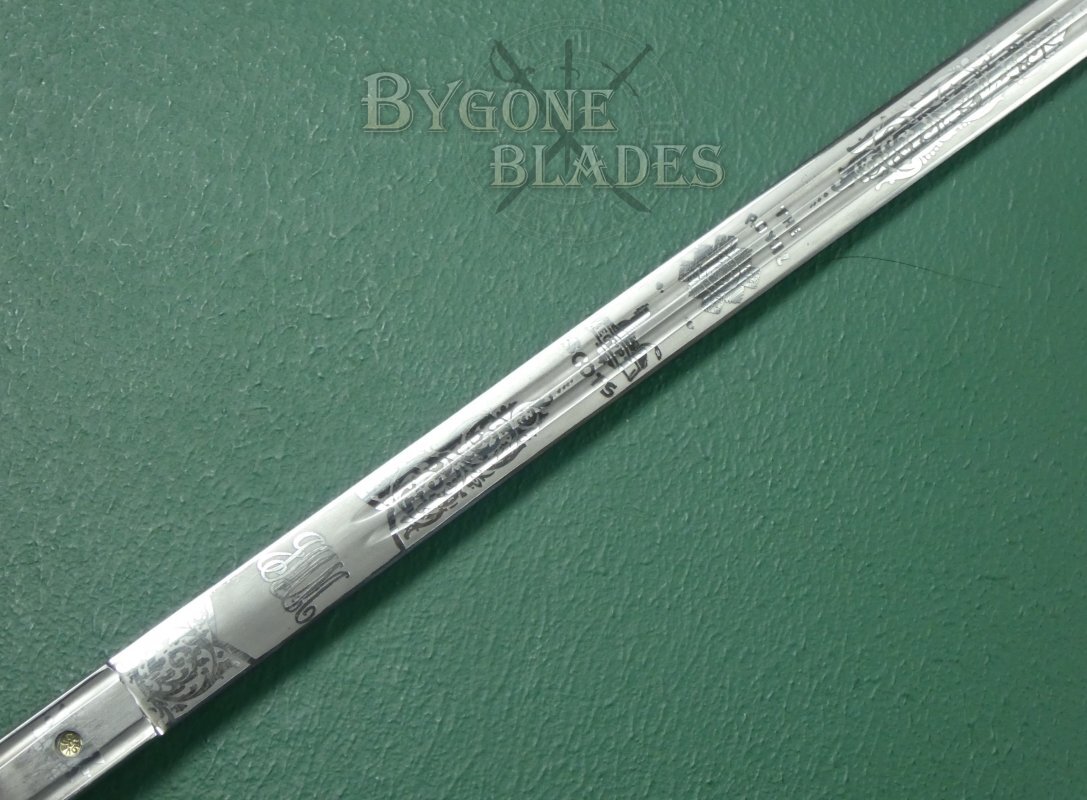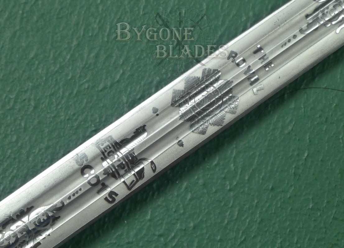 The 815mm double-edged (broadsword) blade has two narrow central fullers and terminates in a spear point. The blade retains its’ factory edge and is in near mint condition with just a small patch of pale tarnish at the point on one side. The blade is etched with the royal cypher of King George V amidst arches and foliate scrollwork. The obverse is etched with the regimental badge of the Royal Scots and a battle honour, a sphinx above the word EGYPT. Surmounting these etchings are the words, “The Royal Scots.” A cartouche on the forte bears the initials JMM for John Munroe Mackenzie.