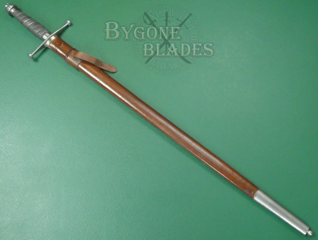 The broadsword is complete with its brown leather covered field service scabbard with a steel chape ending in a ball. The scabbard is in good condition with minor age and use-related scuffs. The sword sheathes and draws smoothly and is held firmly within the scabbard.
