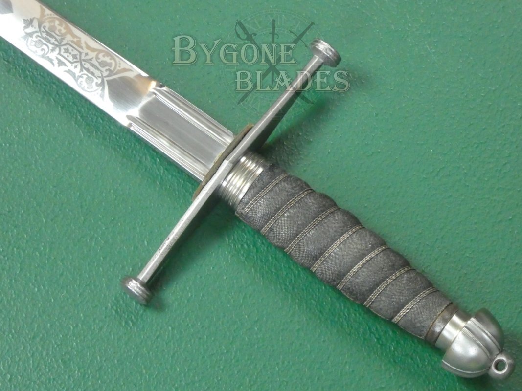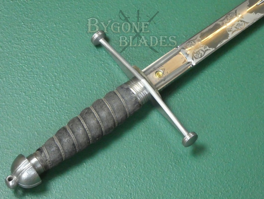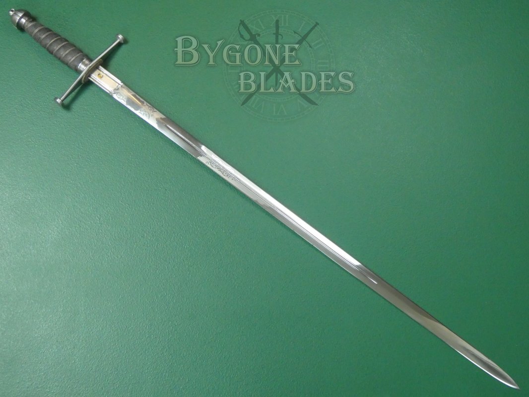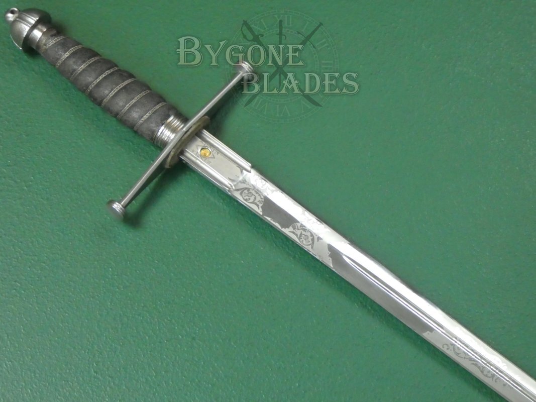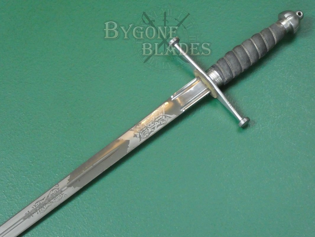 The 825mm double-edged (broadsword) blade has a deep central fuller and terminates in a spear point. The blade retains its factory sharpened edges and is in near mint condition with just a small patch of pale tarnish at the mid-point on one side. The blade is etched with thistles and foliate scrollwork. The obverse is similarly etched.
