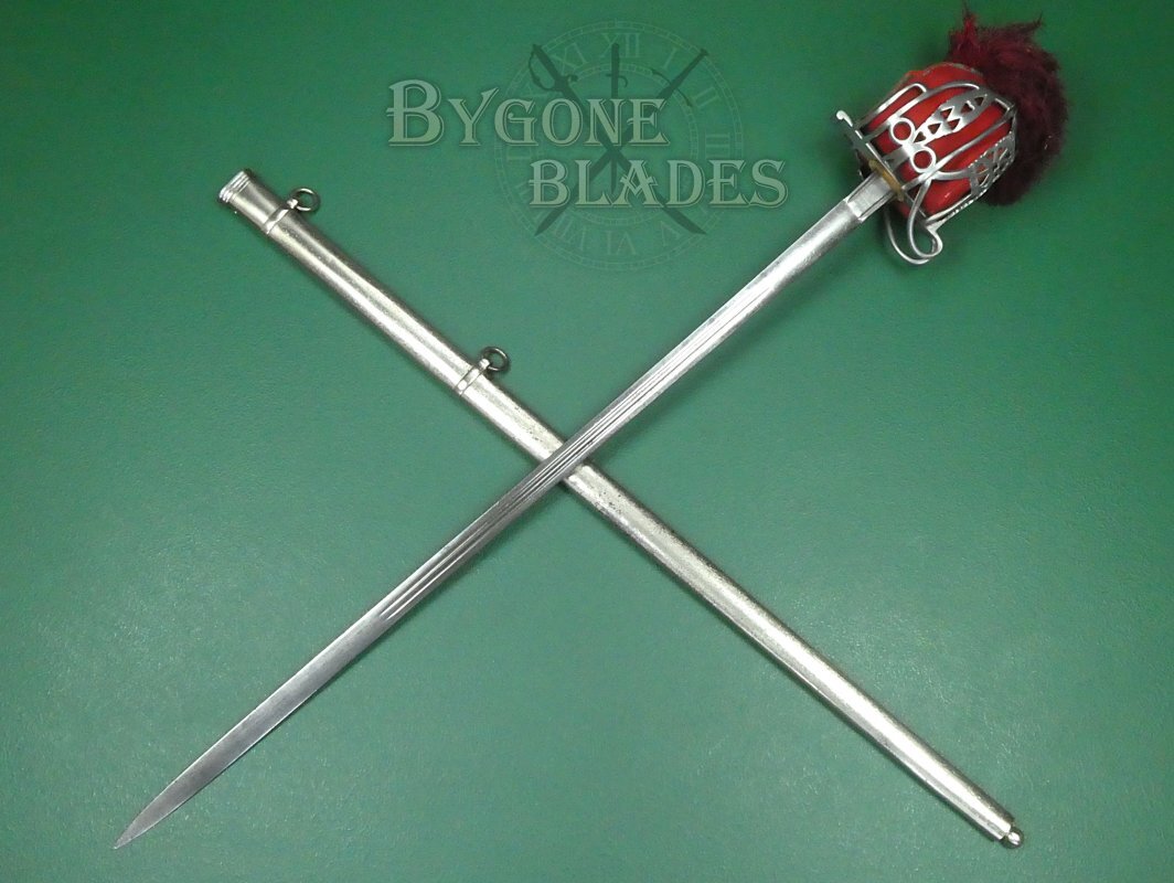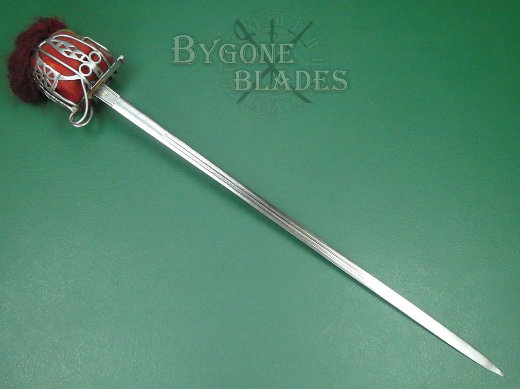 This Victorian, Royal Scots Fusiliers officer’s broadsword was made by Pillin, a renowned 19th Century English sword maker. The Royal Scots were the oldest and most senior line infantry regiment of the British army. The regiment was raised in 1633 during the reign of Charles I of Scotland and served continuously until 2006 when it was amalgamated with the other Scottish regiments to form the Royal Regiment of Scotland.