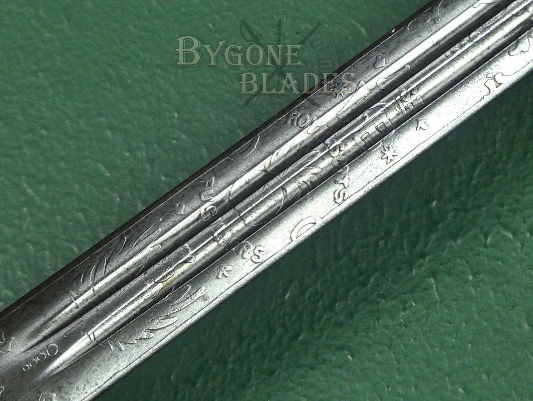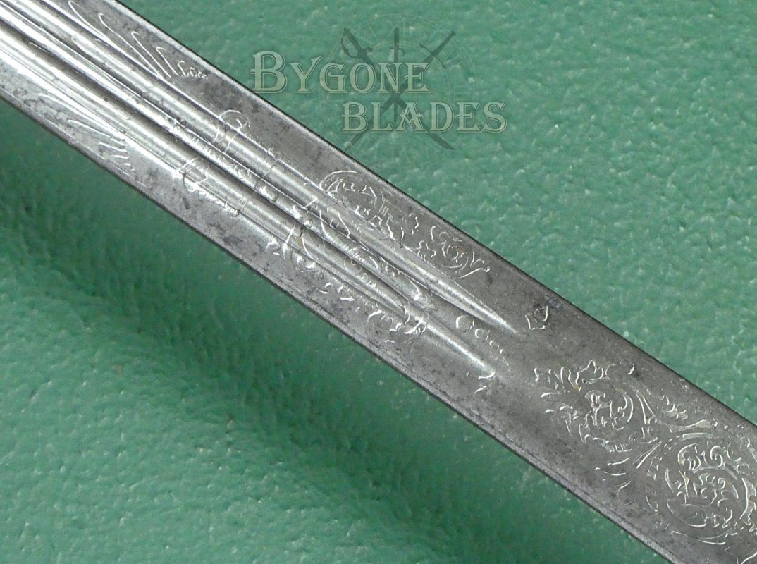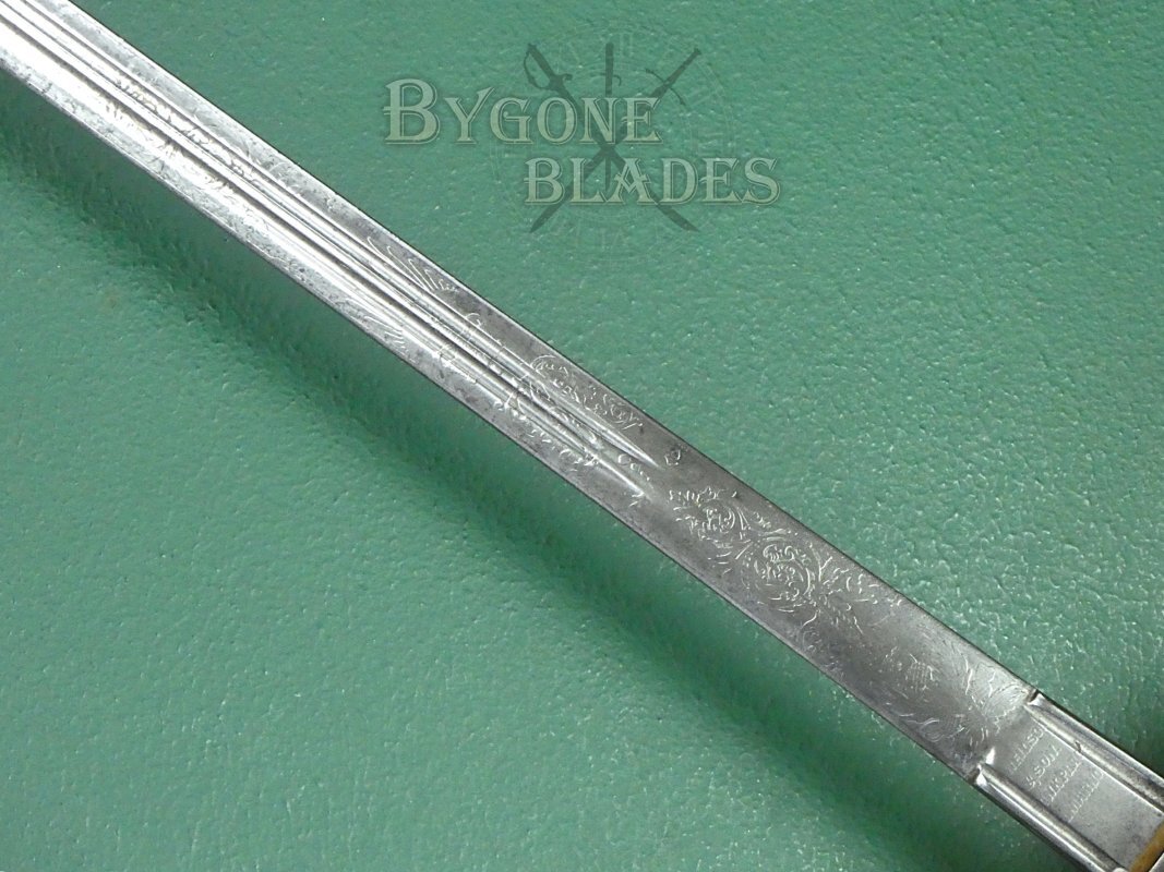 The 830mm double-edged (broadsword) blade has twin, three-quarter length fullers and terminates in a spear point. The blade is etched with foliate scrollwork and arches above and below the flaming grenade of the fusiliers with the regimental title, “1st V. B. Royal Scots Fusiliers” encircling the grenade. The grenade bears a thistle motif. A larger thistle is etched below the regimental emblem. The obverse of the blade is similarly etched with foliate scrollwork and ogee and trefoil arches and bears the royal cypher of Queen Victoria.