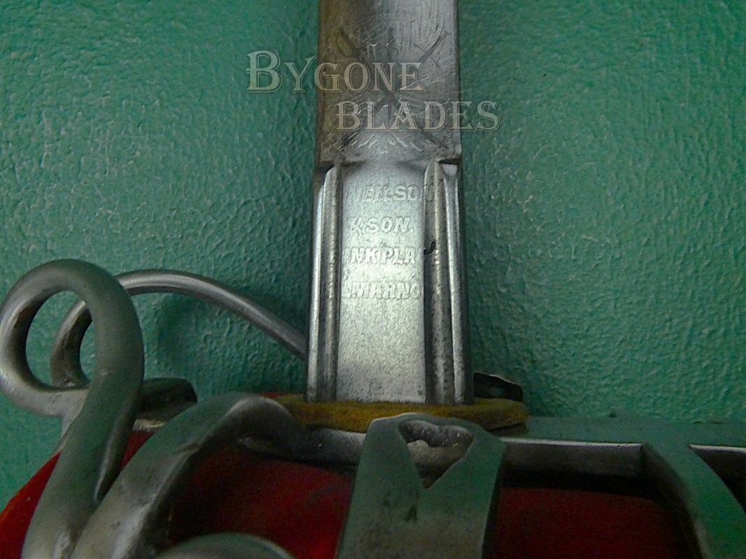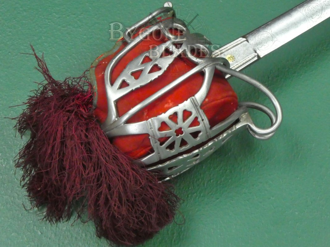 The 1828 pattern basket guard is in good condition and retains its red liner and tassel, albeit with some wear and discolouration.