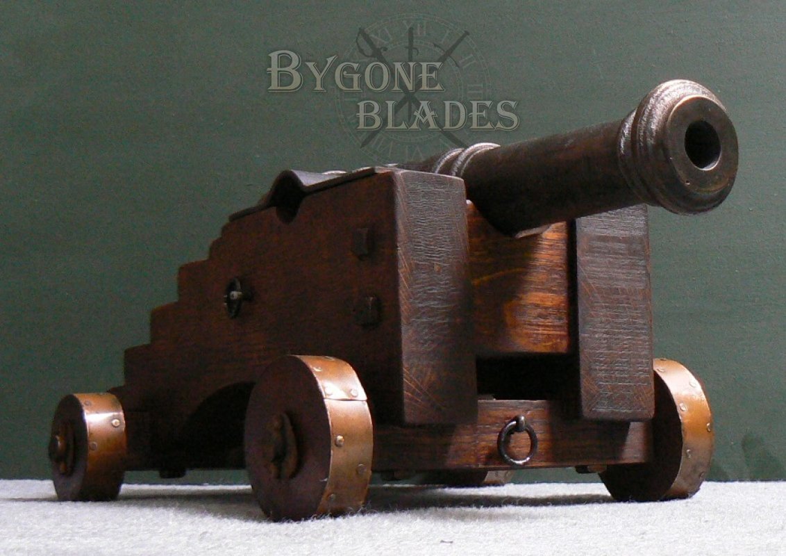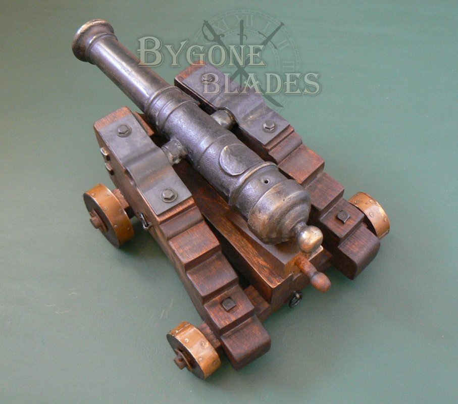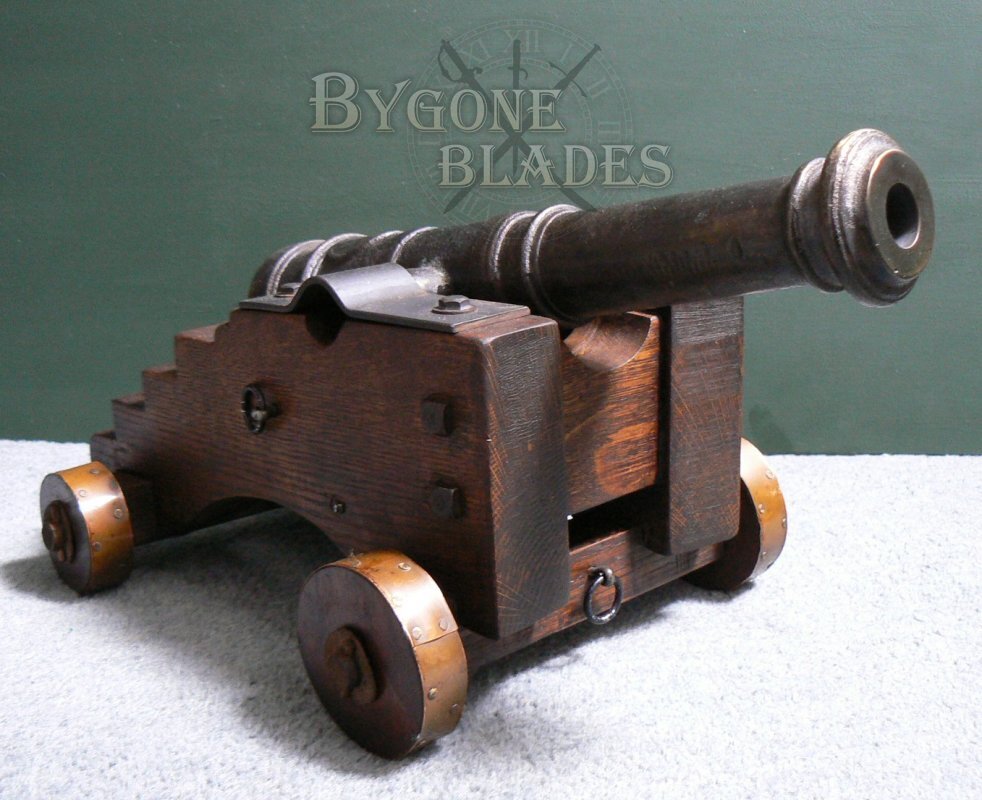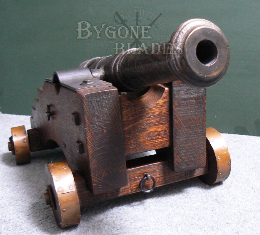 Very heavy black powder signal cannon on a navy style truck. The truck is hand-made of oak and is nicely detailed and very robust. There is a wedge for elevating and lowering the barrel. The oak wheels have copper rims.