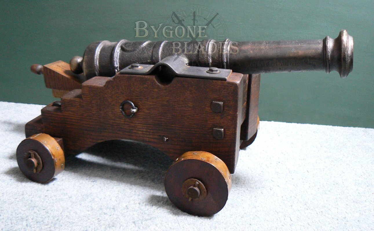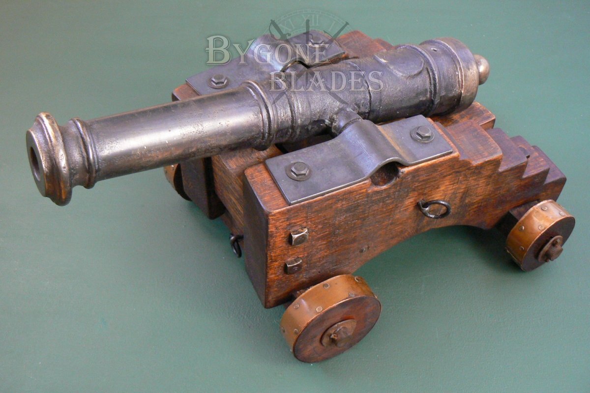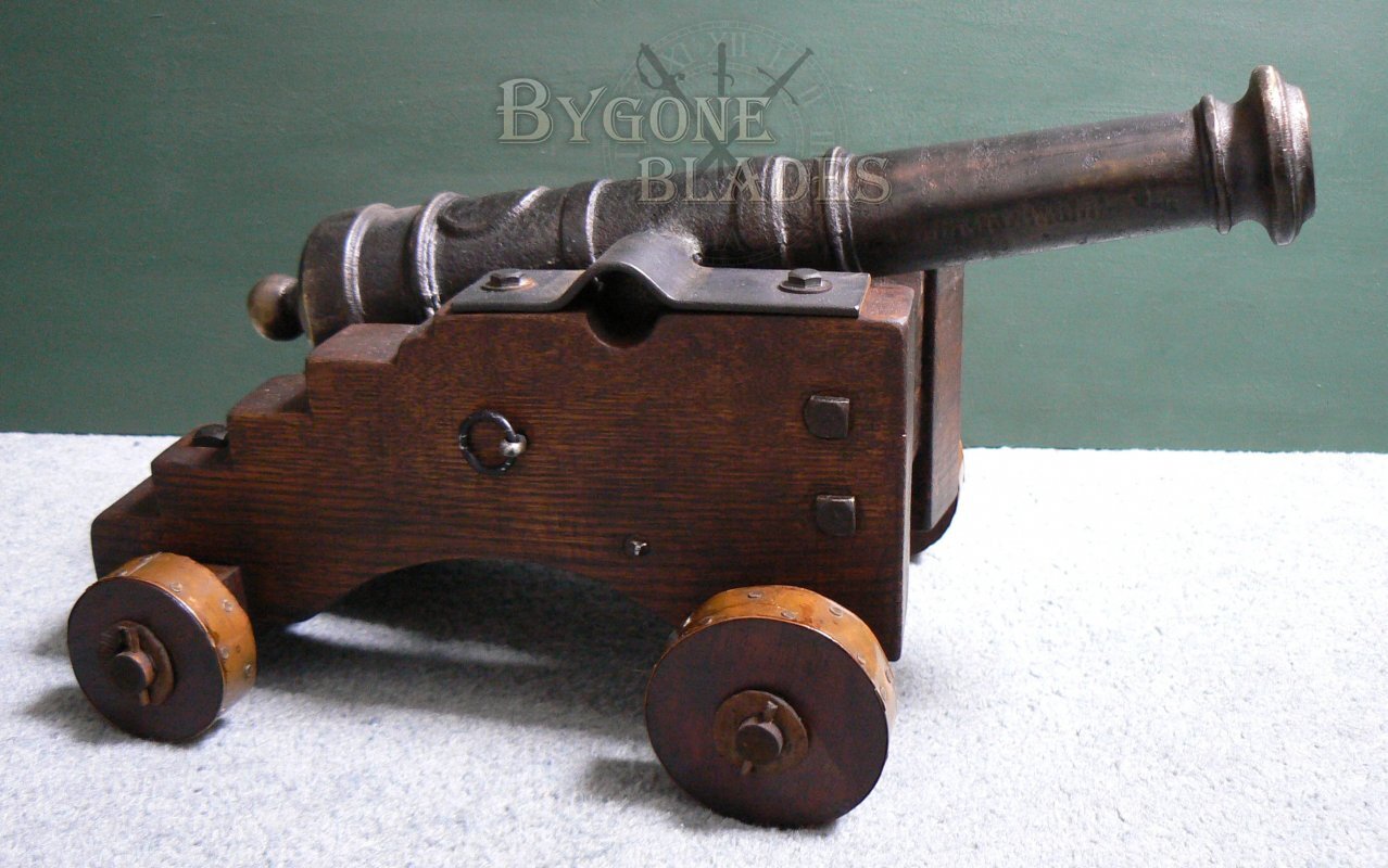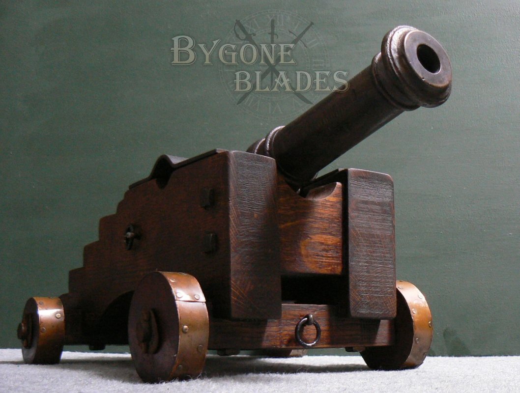 Very heavy black powder signal cannon on a navy style truck. The truck is hand-made of oak and is nicely detailed and very robust. There is a wedge for elevating and lowering the barrel. The oak wheels have copper rims.