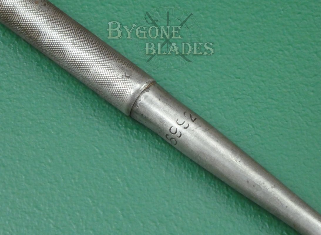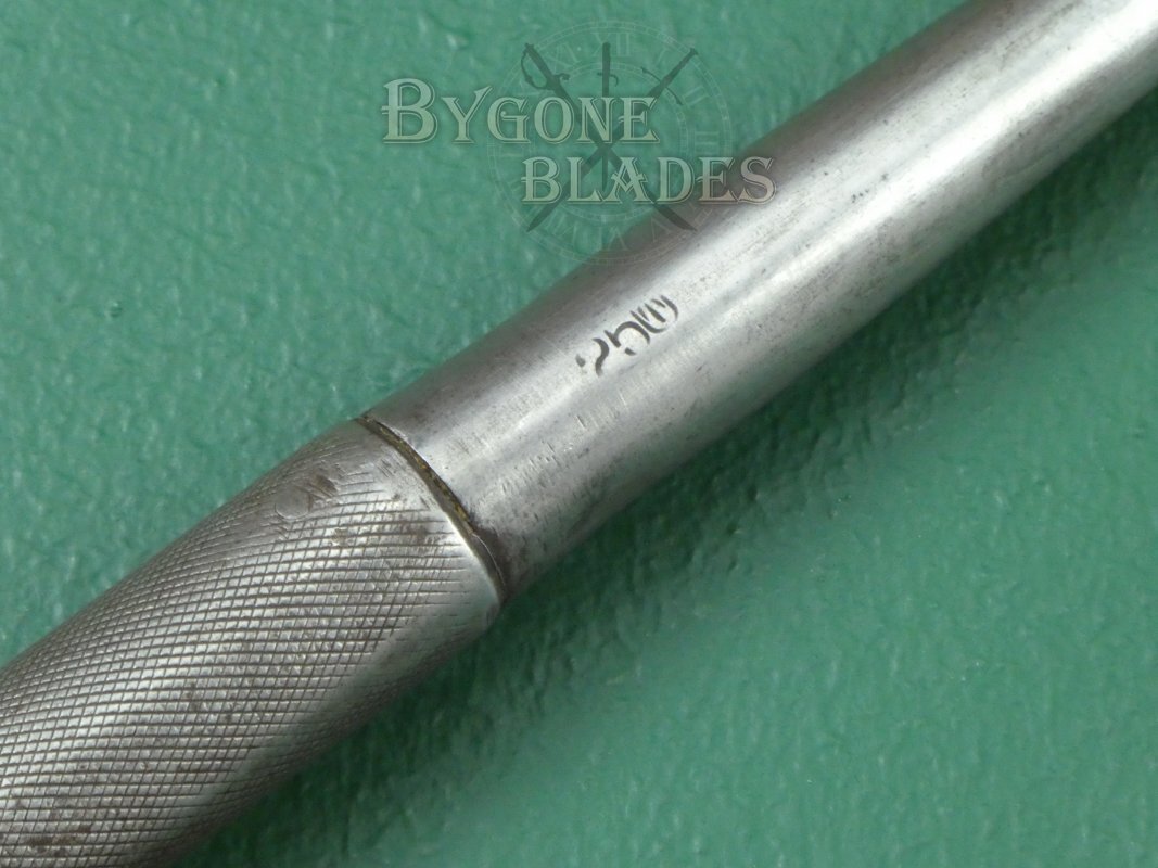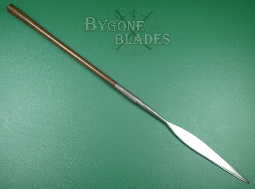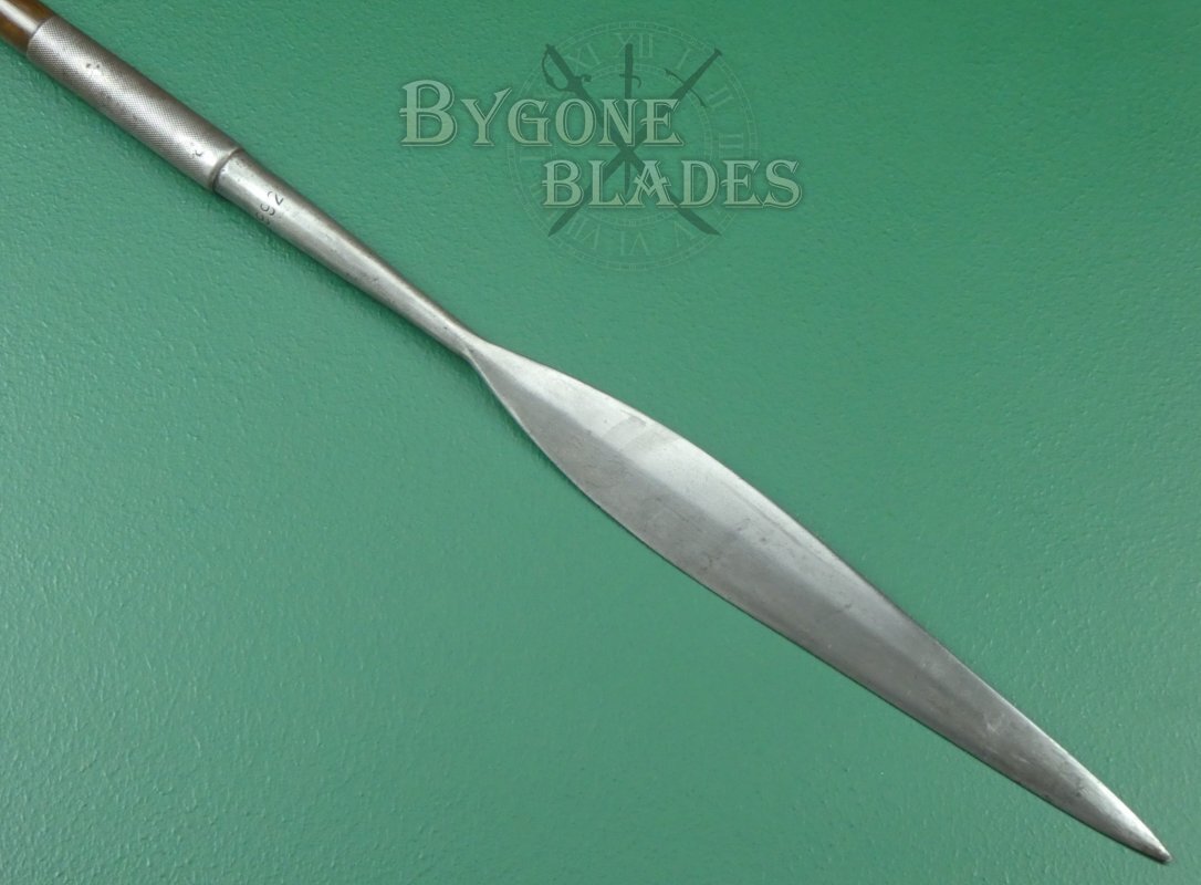 The blade has a 230mm long socket that is riveted to the hardwood haft. The first section of the socket is plain and is stamped with the Union of South Africa ownership mark, an arrow within the letter U. The union of South Africa was founded in 1910. Besides the Government ownership stamp is the date stamp 25 (1925), making this quite an early example of these rare spears. The opposite side of the socket bears the serial number 6992. The rear section of the socket has a knurled finish and bears a second, small Union of South Africa ownership mark. The blade is firm in the haft.