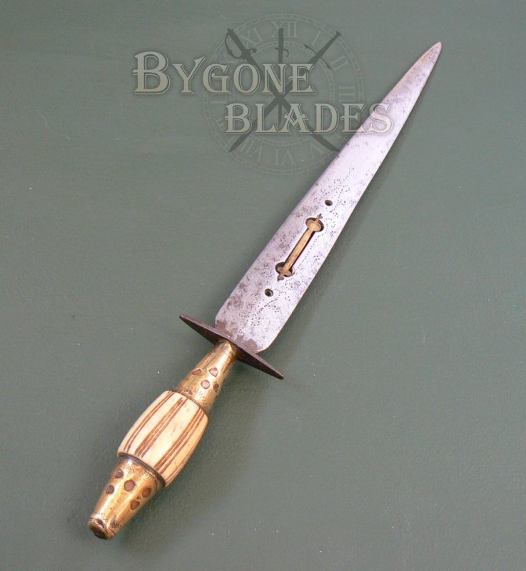 The 233mm double-edged blade is of flattened diamond section form. The hand-forged blade is decorated with piercings along the medial ridge, the larger being inlaid with brass. The pierced decoration is surrounded by an intricate pattern of punched dots.