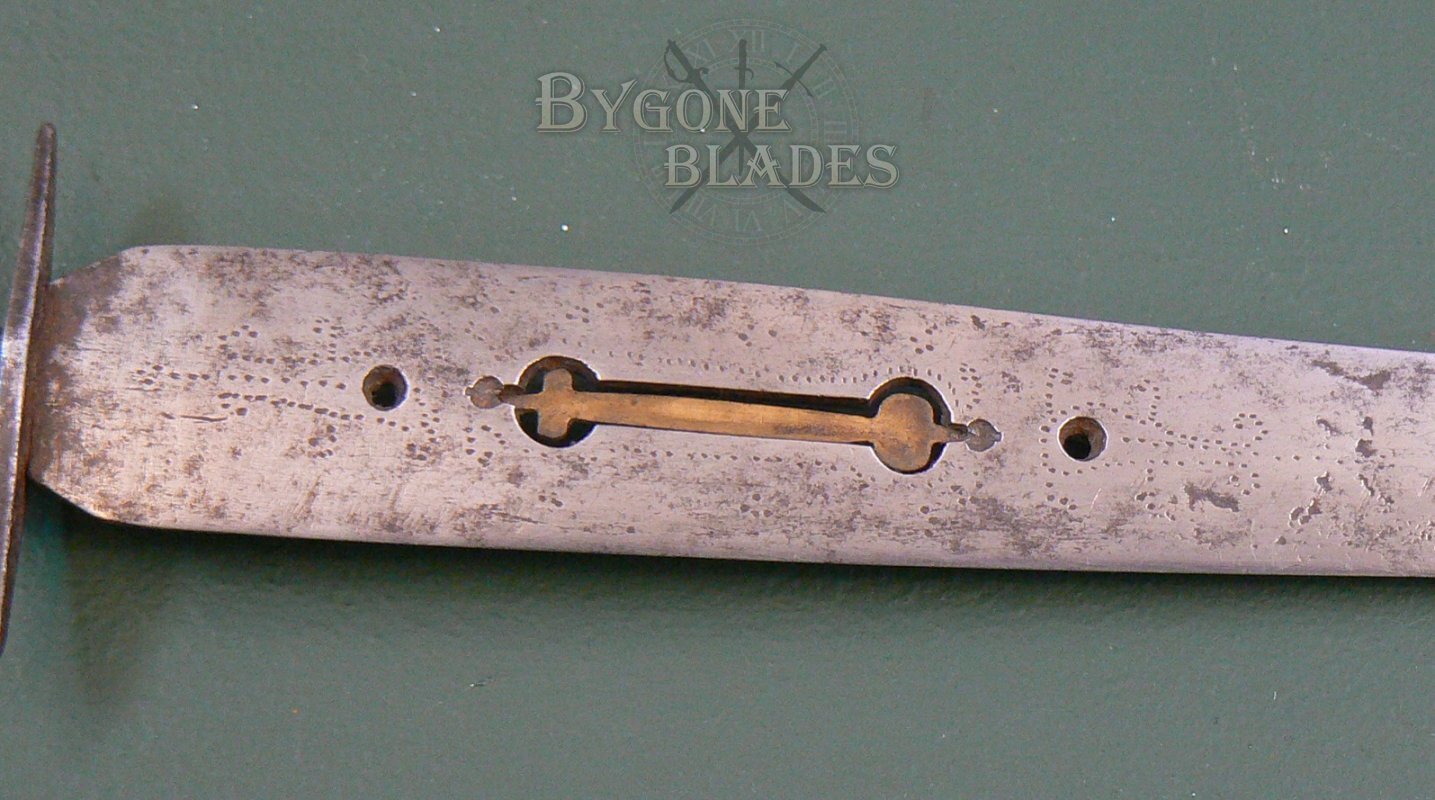 The elongated diamond crosspiece is made of iron and the hilt is brass and bone. The brass is inlaid with a pattern of copper dots and has an incised zigzag pattern.