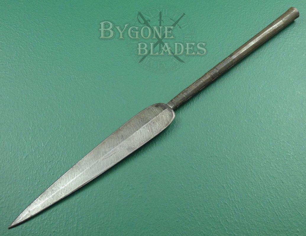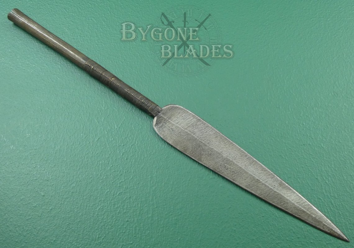 This spear has a 240mm double-edged blade. The leaf-shaped blade has a flattened diamond cross-section with a raised medial ridge.